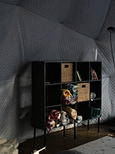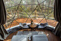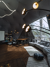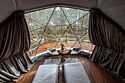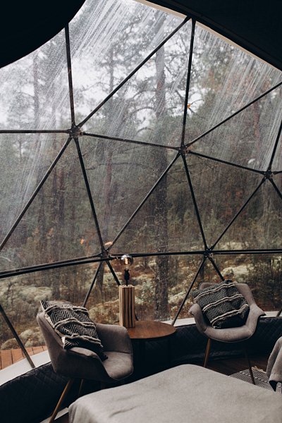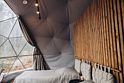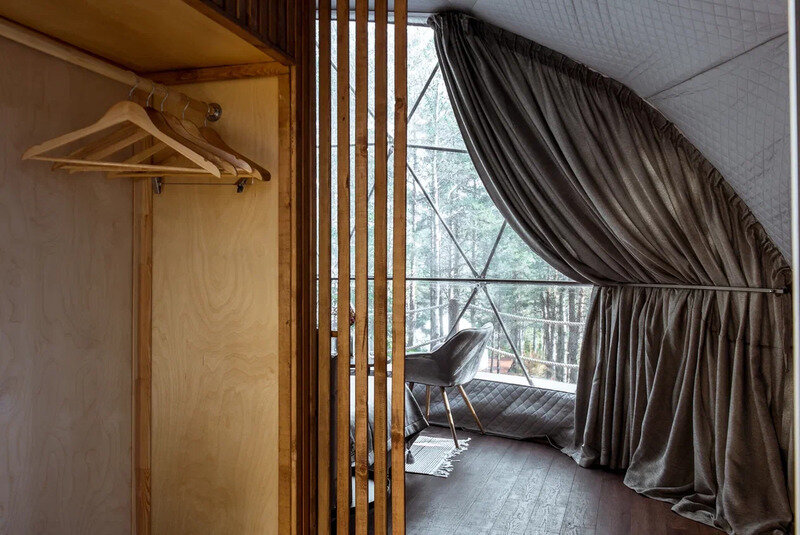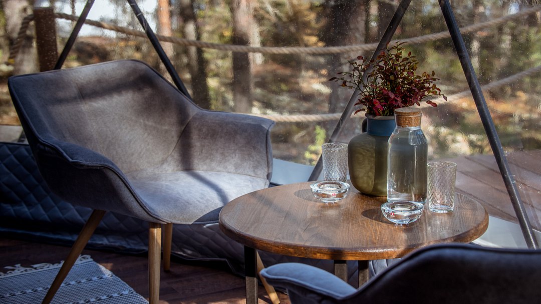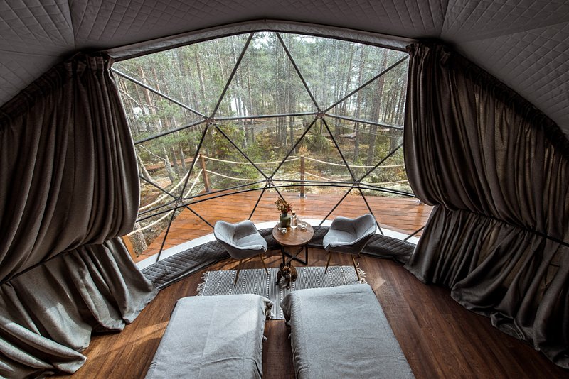 Внутри геокупола две удобные кровати или одна большая для пар и дополнительное спальное место наверху, прикроватный столик, два кресла и журнальный стол у панорамного окна с видом на лес и озеро. Шкаф для одежды, 3 варианта освещения, розетки, биотуалет и раковина для умывания (вода комнатной температуры, без подогрева, ограничение по подаче). Каждому гостю предоставляется два полотенца.