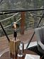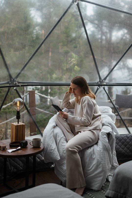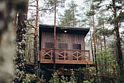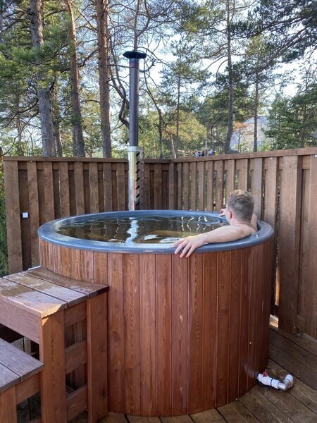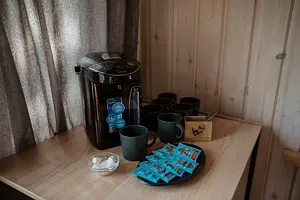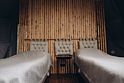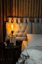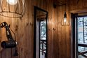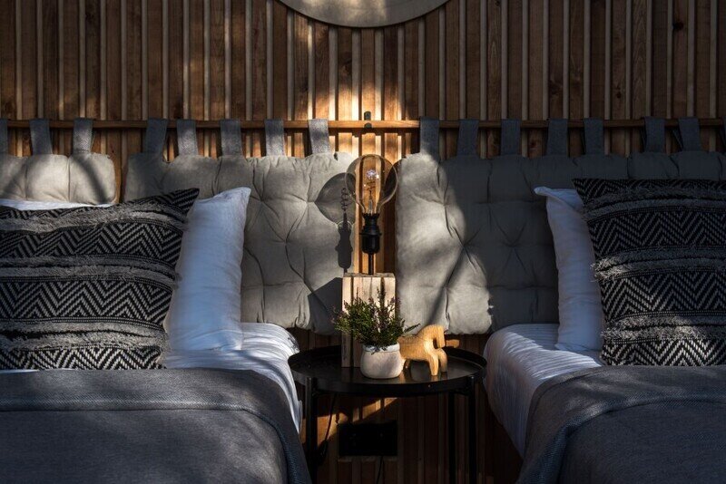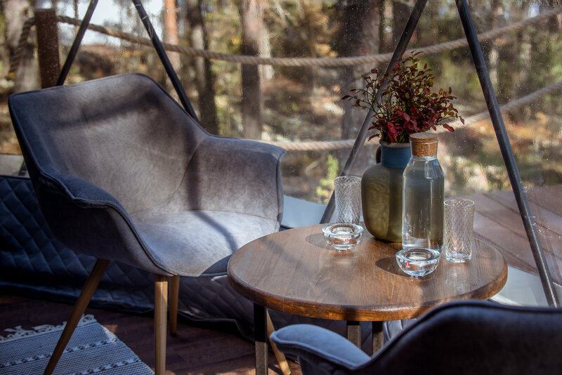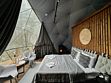 Рассчитан на 2-3 человека. Внутри две удобные нижние кровати или одна большая для пар и дополнительное спальное место наверху, прикроватный столик, два кресла и журнальный стол у панорамного окна с видом на лес и озеро. Также шкаф для одежды, розетки, биотуалет и раковина для умывания. Каждому гостю предоставляется два полотенца.