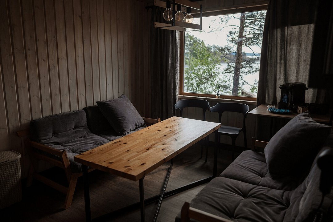 Уют в лаунж-зоне создают мягкие удобные диванчики и подушки в виде карельских валунов. Здесь всегда можно почитать книгу, написать в блокнот заветное желание или поиграть в настольные игры.Экспресс-тур в глэмпинг