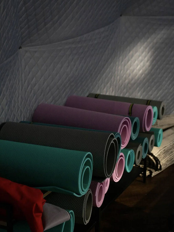 Внутри достаточно места и есть индивидуальные фитнес-коврики, которые можно взять для проведения тренировок и практик. В куполе могут заниматься одновременно около 20 человек.