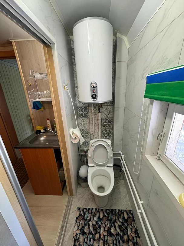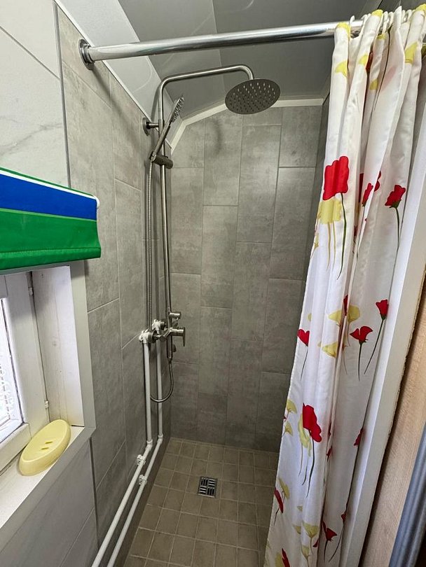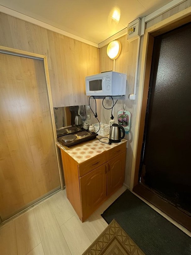 Домик рассчитан на проживание двух человек и обеспечен горячей и холодной водой. Внутри созданы комфортные условия для проживания: кухня-гостиная, отдельная спальня, душ и санузел. Для приготовления пищи в распоряжении гостей: микроволновка, холодильник, электроплита, чайник и полный комплект кухонной посуды и принадлежностей.