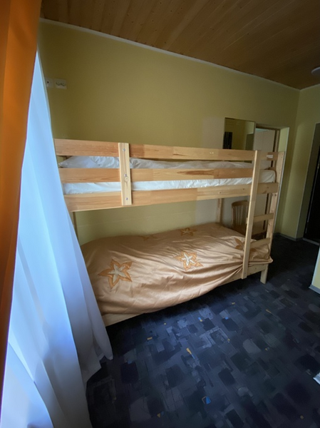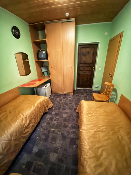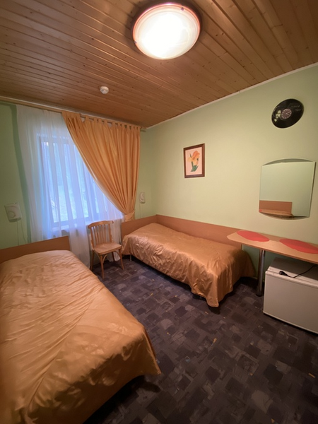 - Одна спальня: две кровати, одна прикроватная тумбочка. Вид на озеро;