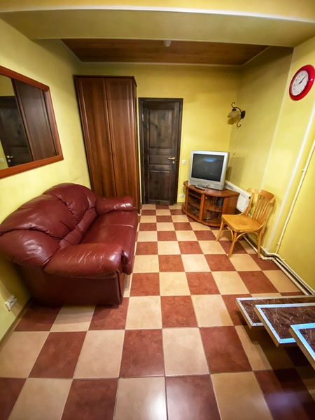 - Гостиная: камин, раскладной двуспальный диван, телевизор, тумбочка, стол, стулья, зеркало;