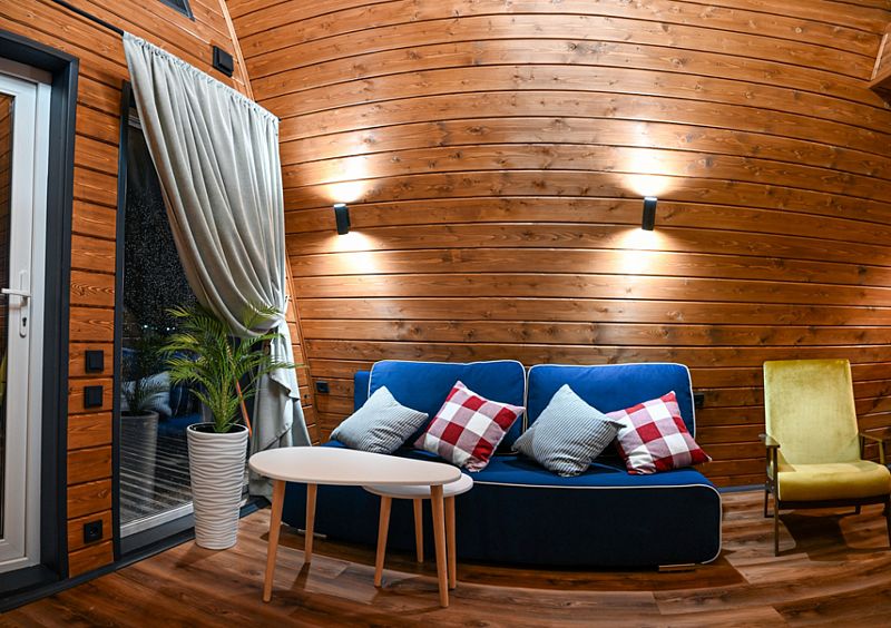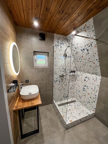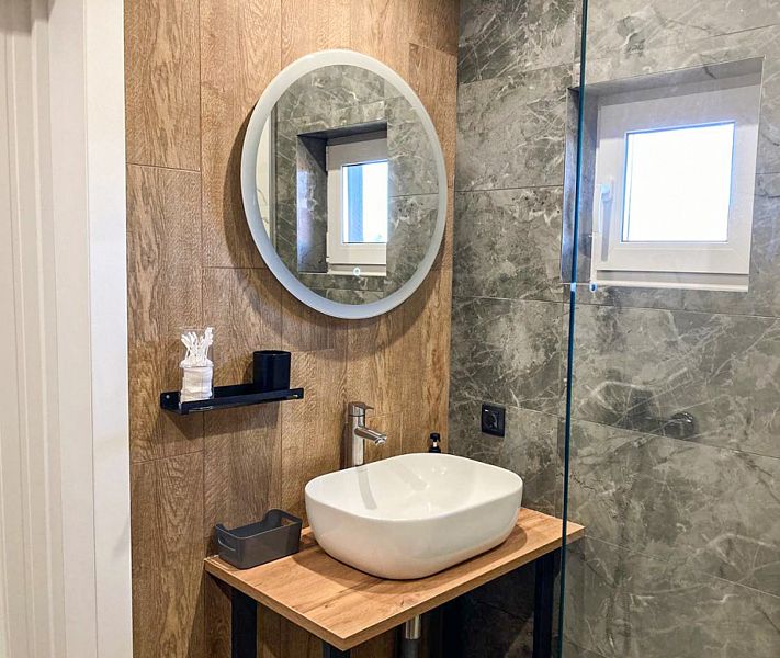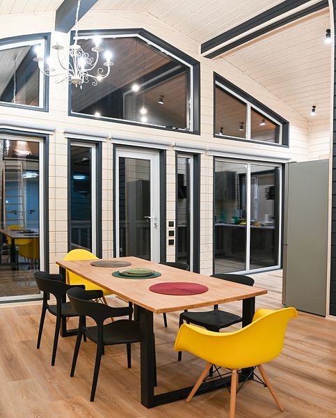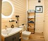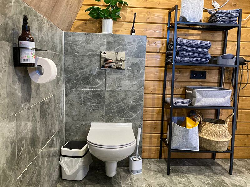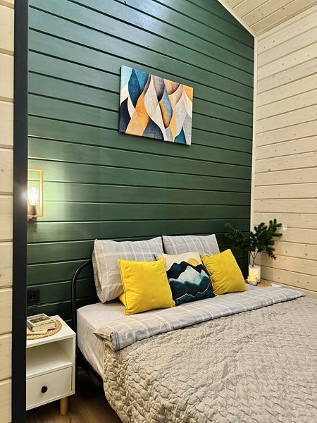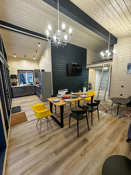 Дом новый, сделан с большой любовью к гостям, с проходными выключателями, с достаточным количеством розеток, с теплыми электрическими полами в душевой, с пассивной вентиляцией, панорамным остеклением и мансардным окном на лофт этаже.