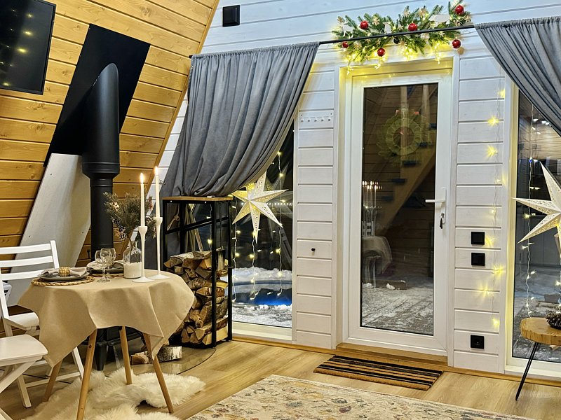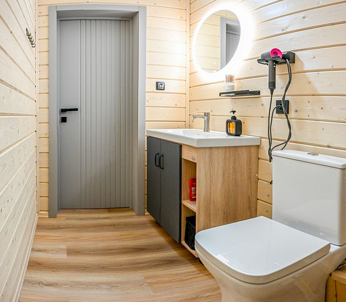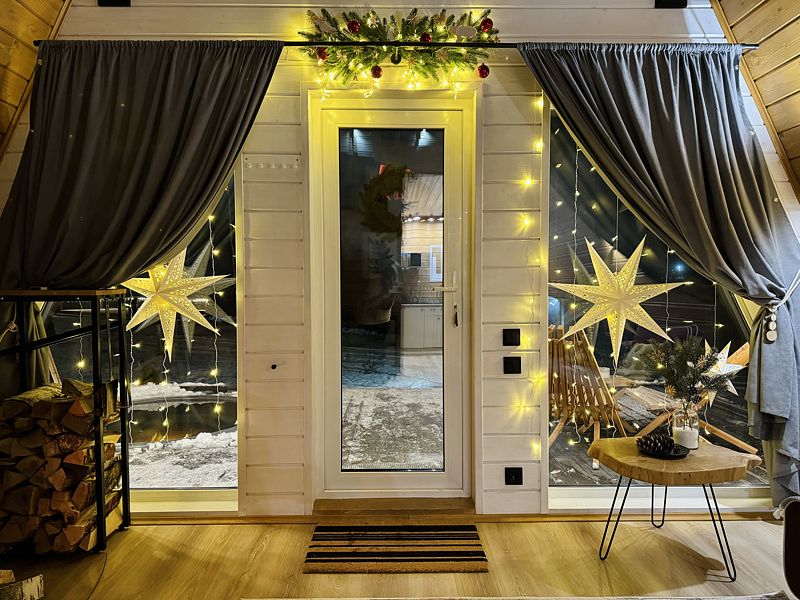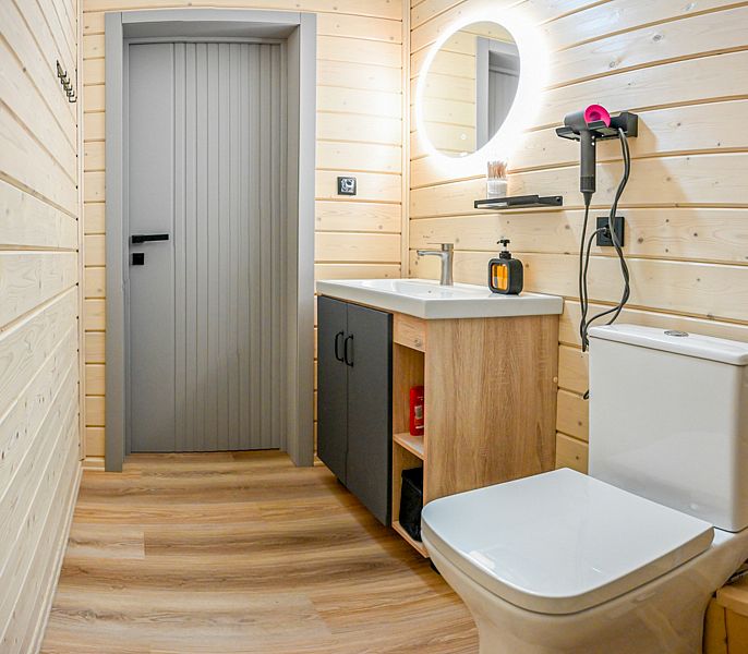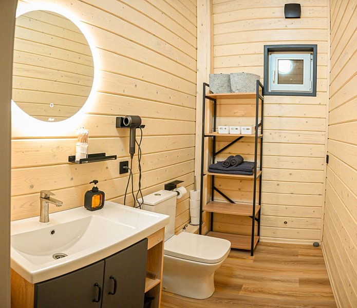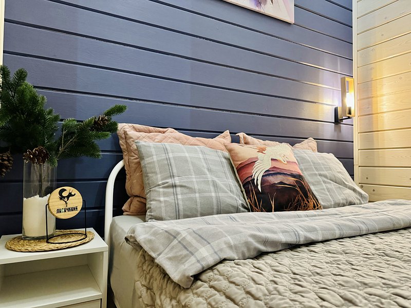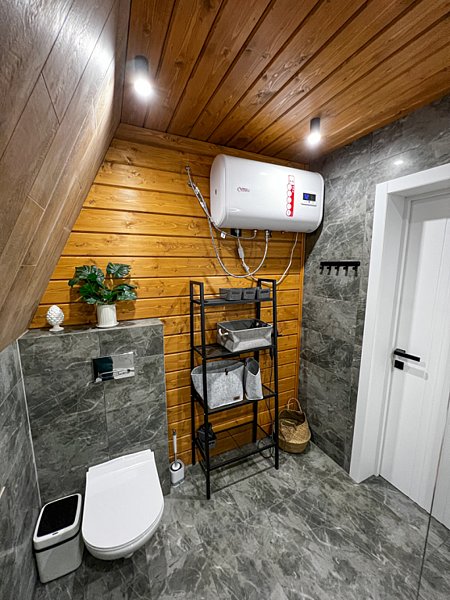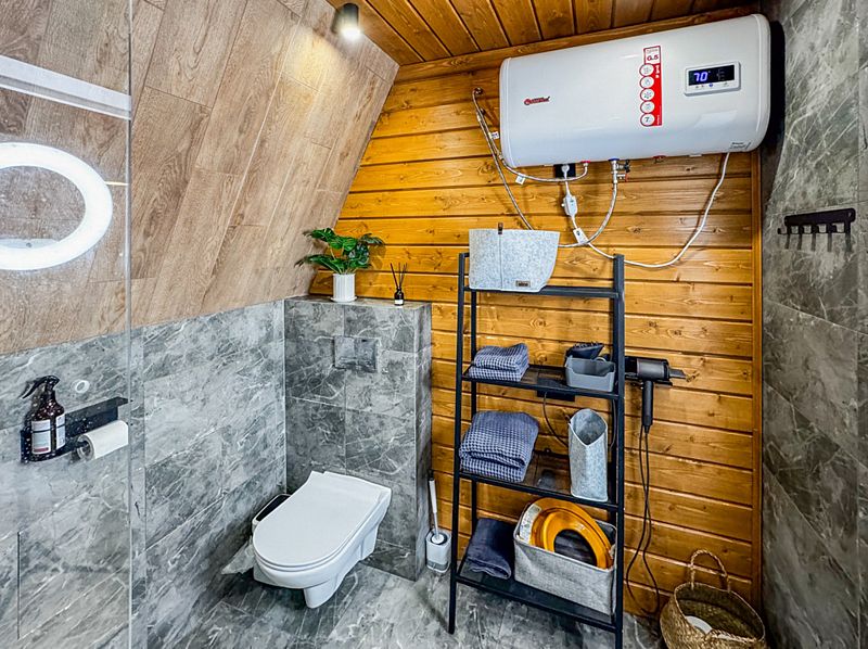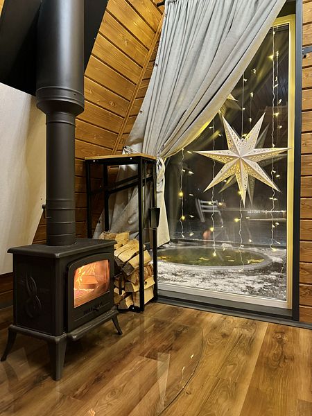 Дом новый, сделан с большой любовью к нашим гостям, с проходными выключателями, с достаточным количеством розеток, с теплыми электрическими полами в душевой, с пассивной вентиляцией, панорамным остеклением, телевизором со смарт ТВ, мансардным окном на лофт этаже, камином и подогреваемой гидромассажной купелью.