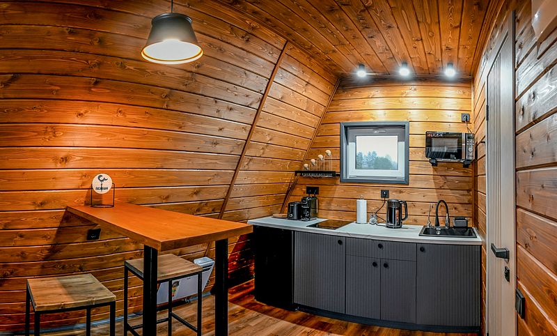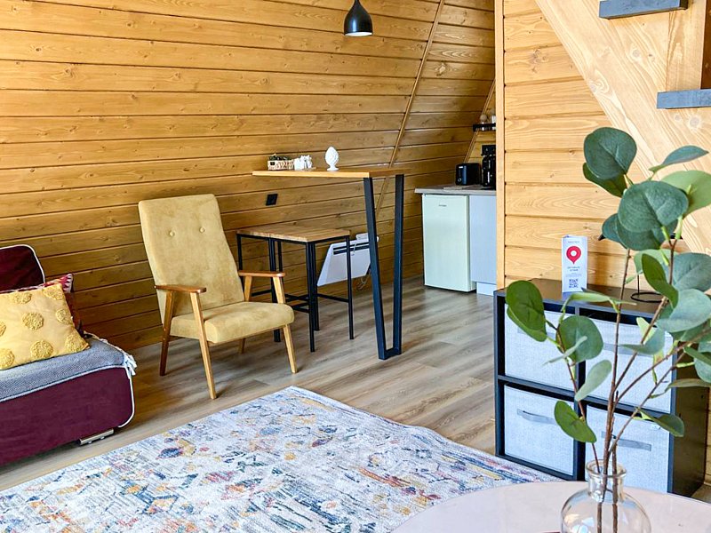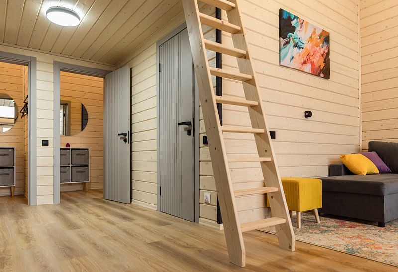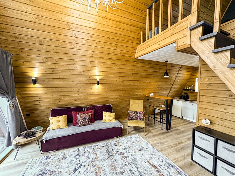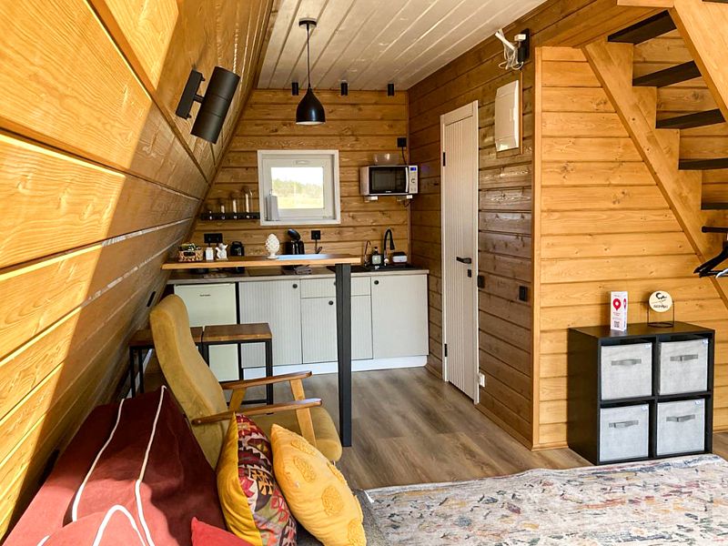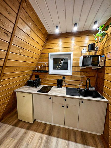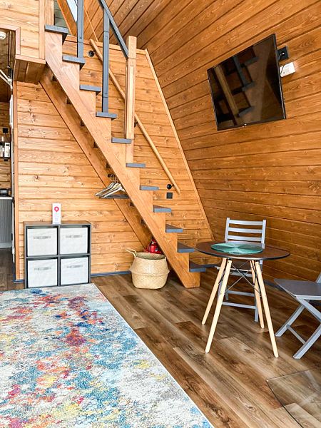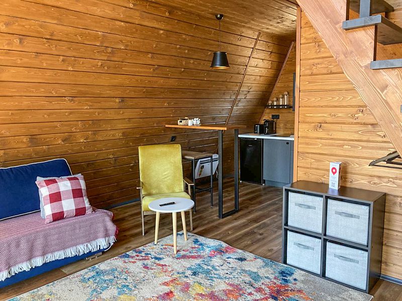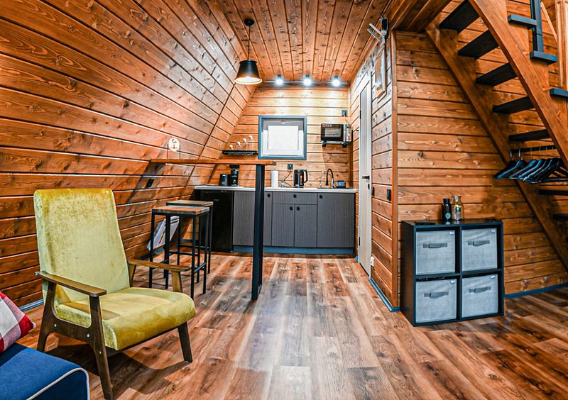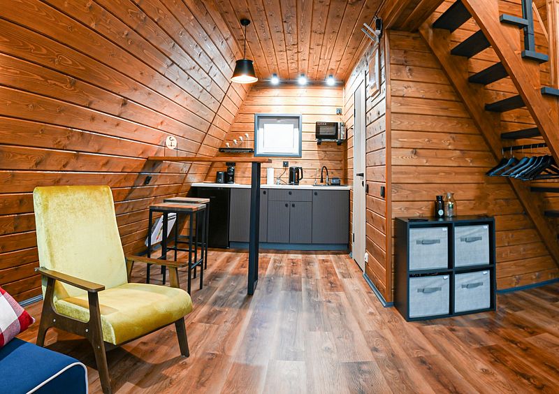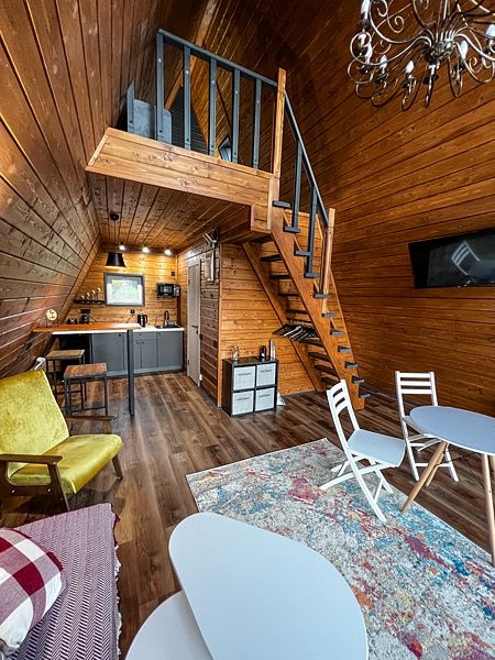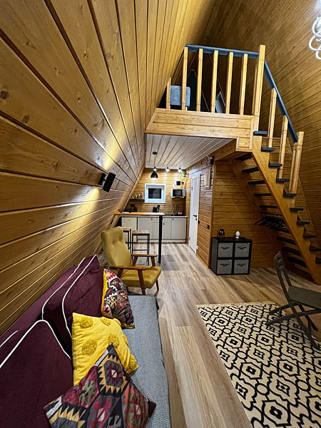 В доме лофт этаж, кухня-гостиная, туалет и душевая.