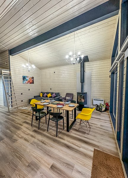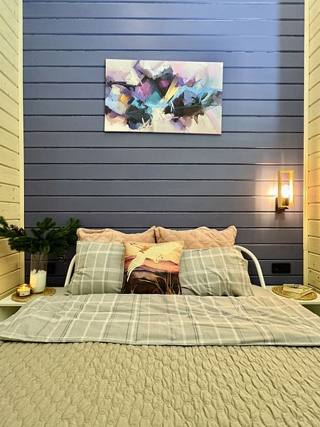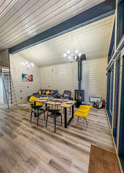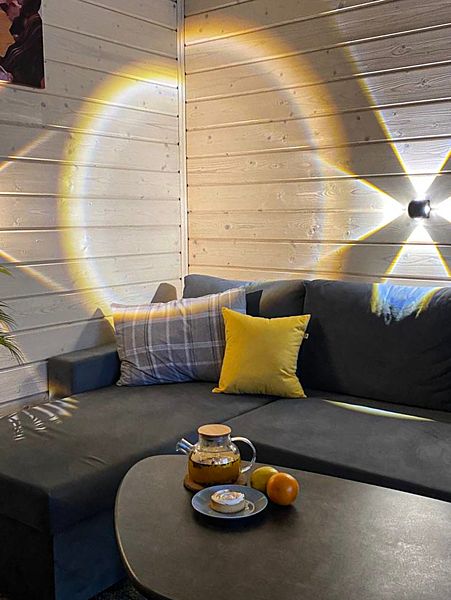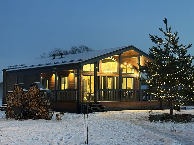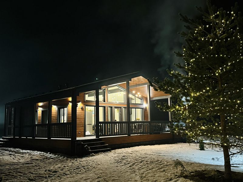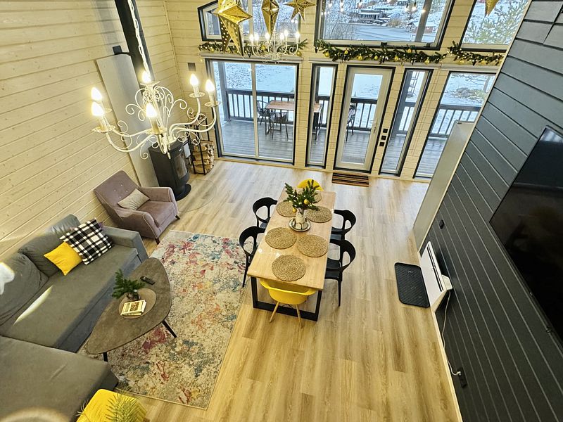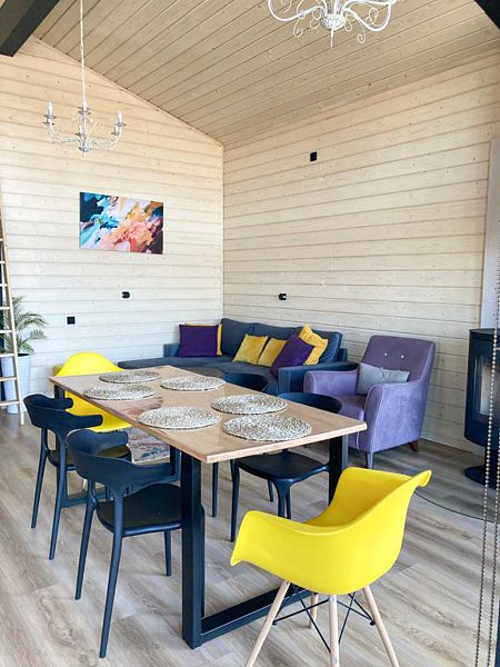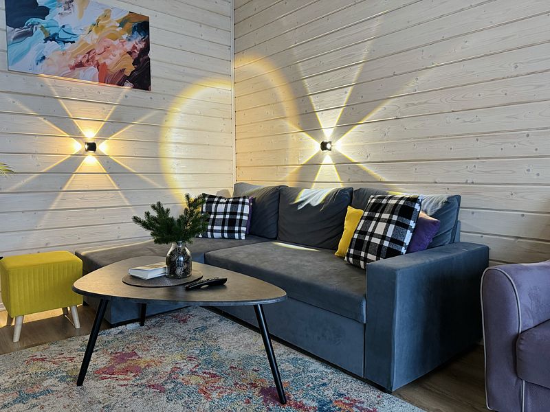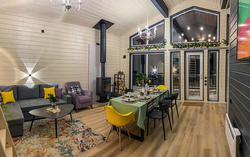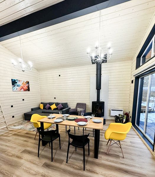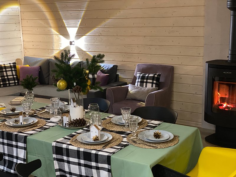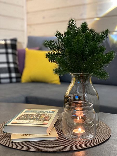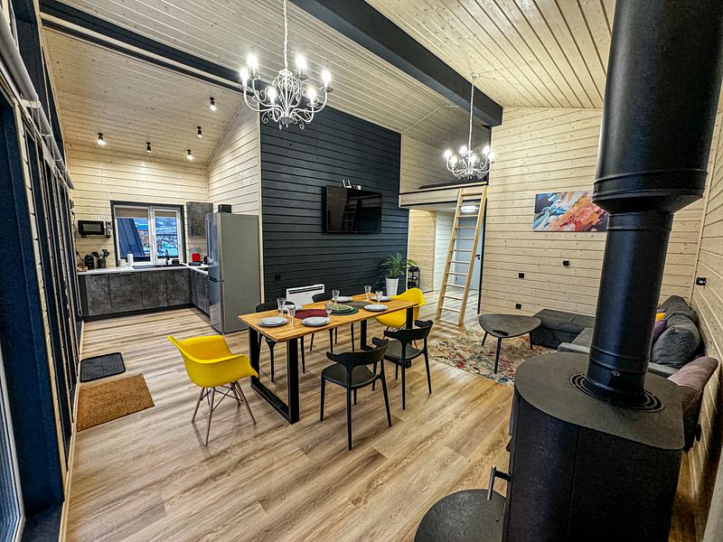 Дом новый, сделан с большой любовью к нашим гостям, с проходными выключателями, с достаточным количеством розеток, с теплыми электрическими полами в душевой, в зоне кухни и туалета, с пассивной вентиляцией, панорамным остеклением, телевизором со смарт ТВ, мансардным окном на лофт этаже и с большой сауной с можжевельником и гималайской солью.