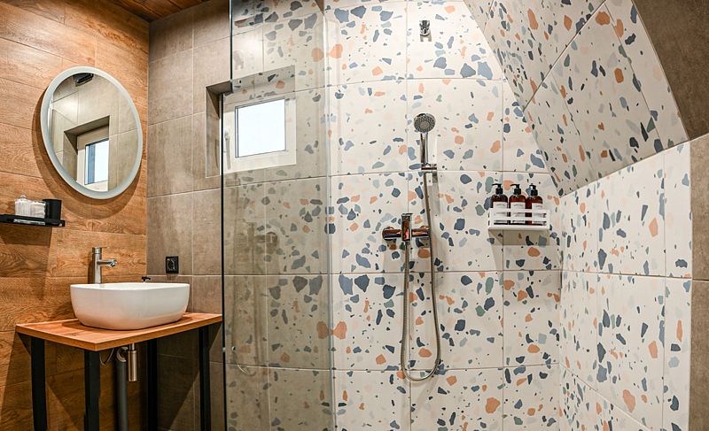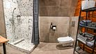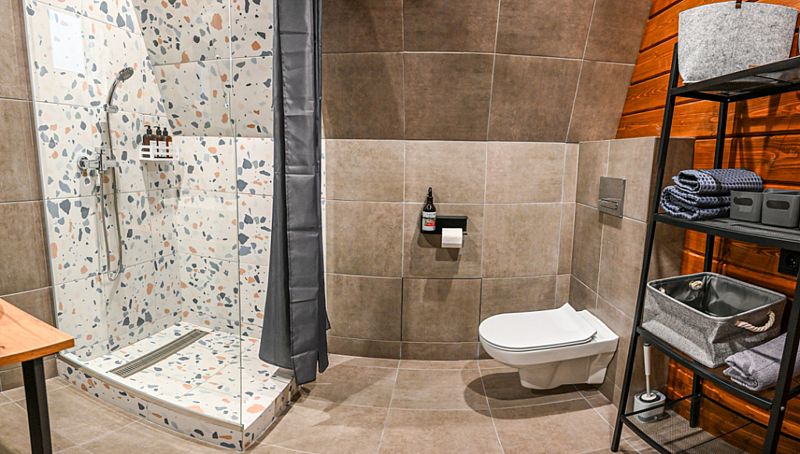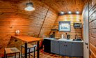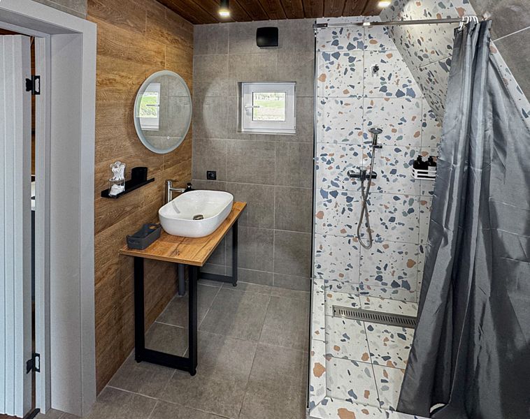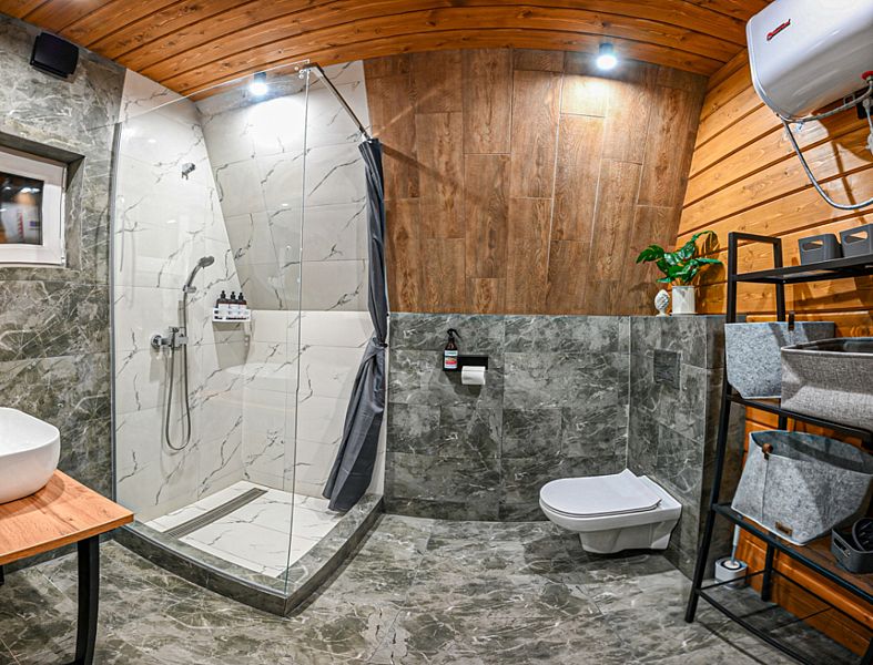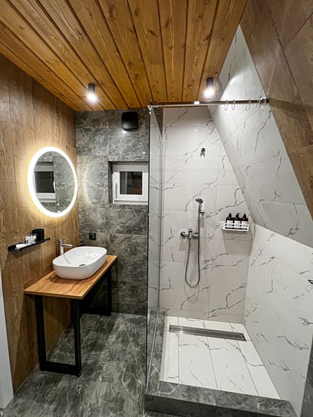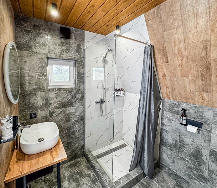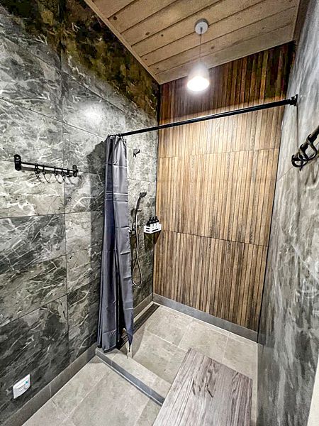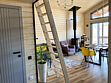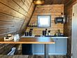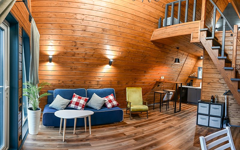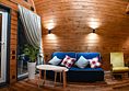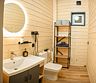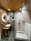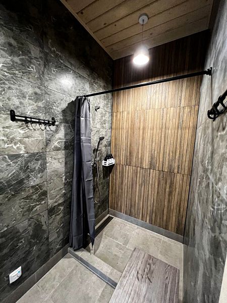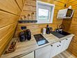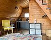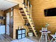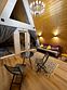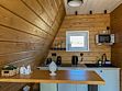 В доме лофт этаж, кухня-гостиная, туалет, душевая и терраса со встроенной купелью.