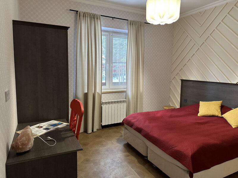 Номера категории комфорт, двухкомнатный номер с двуспальной кроватью в одной комнате и с двумя одноместными 2-х этажными кроватями) и диваном в своей зоне отдыха. Санузел и душ в номере.