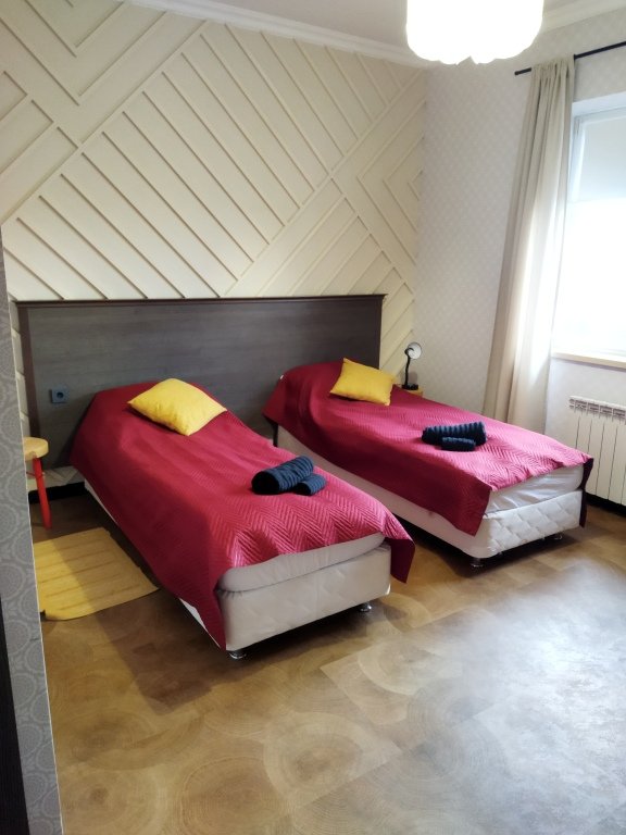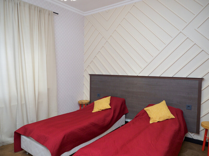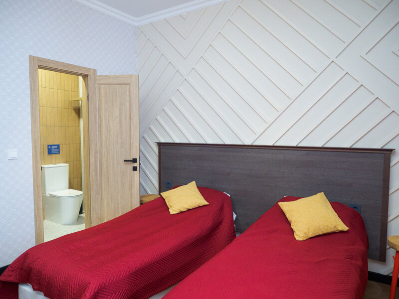 2 односпальные кровати или 1 двуспальная + дополнительное место. Санузел и душ в номере.