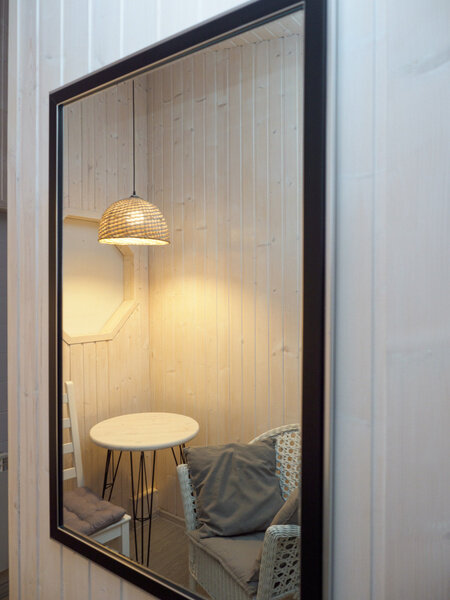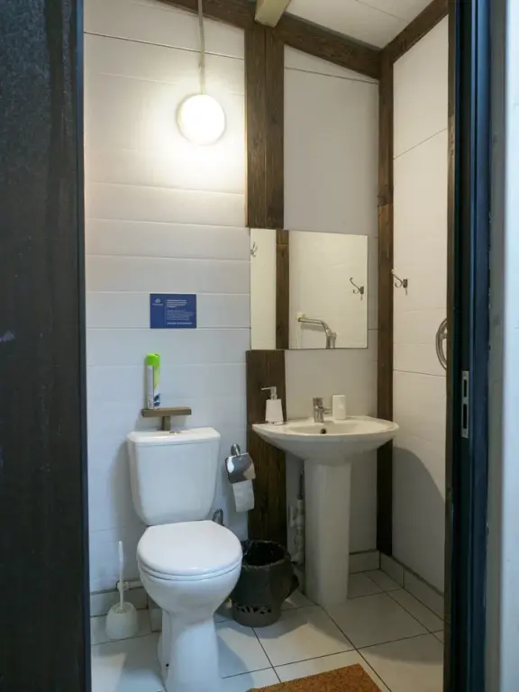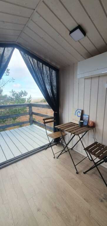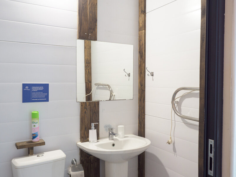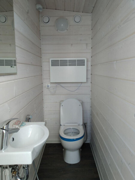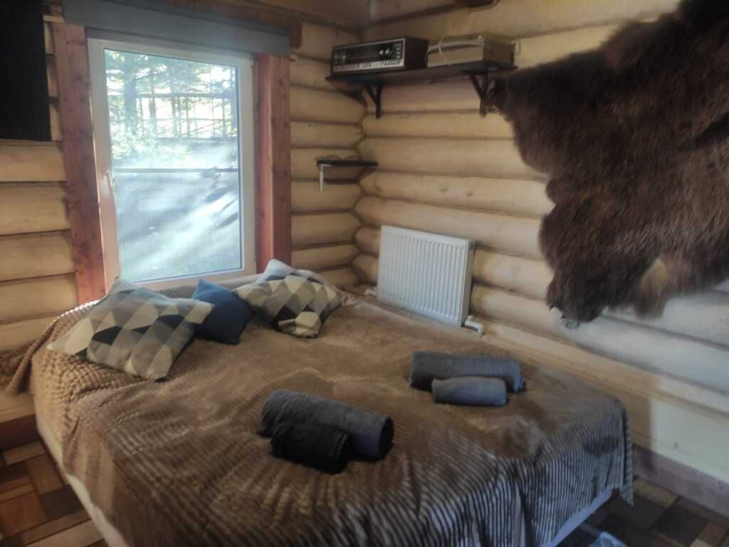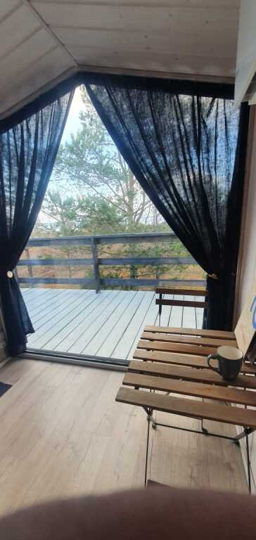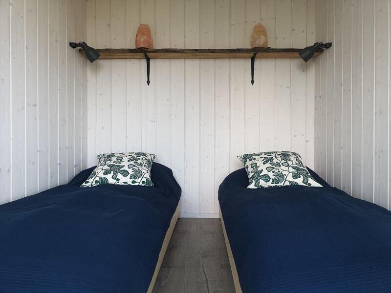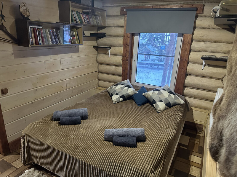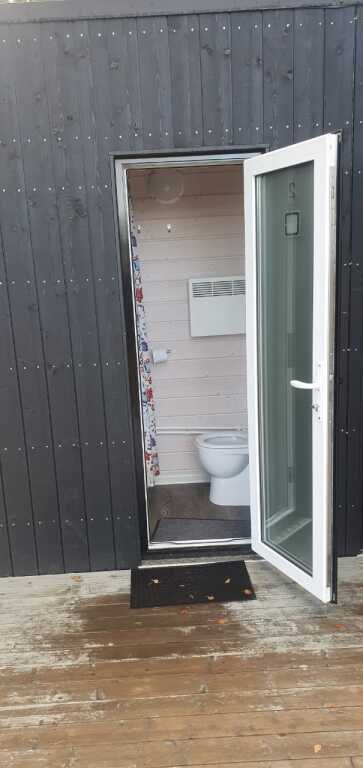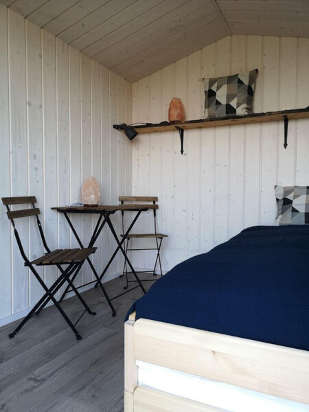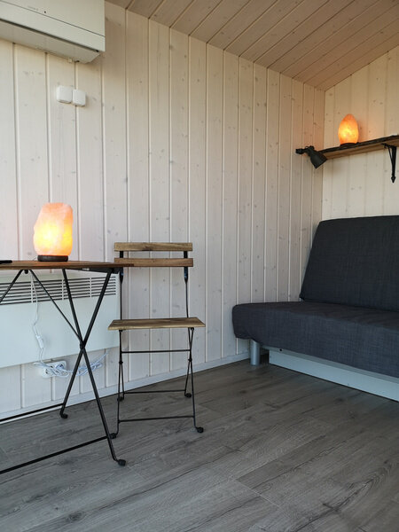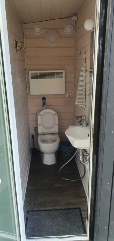 В домике: две односпальные кровати или диван, который раскладывается в двуспальный, столик, 2 стула, полка, кронштейн для одежды, теплые полы, отопление и вентиляция. Современный сантехнический блок находится отдельно (2 душа и 4 WC), всего в нескольких метрах по деревянным настилам от входа в домик. К вашим услугам бесплатная частная парковка на месте.