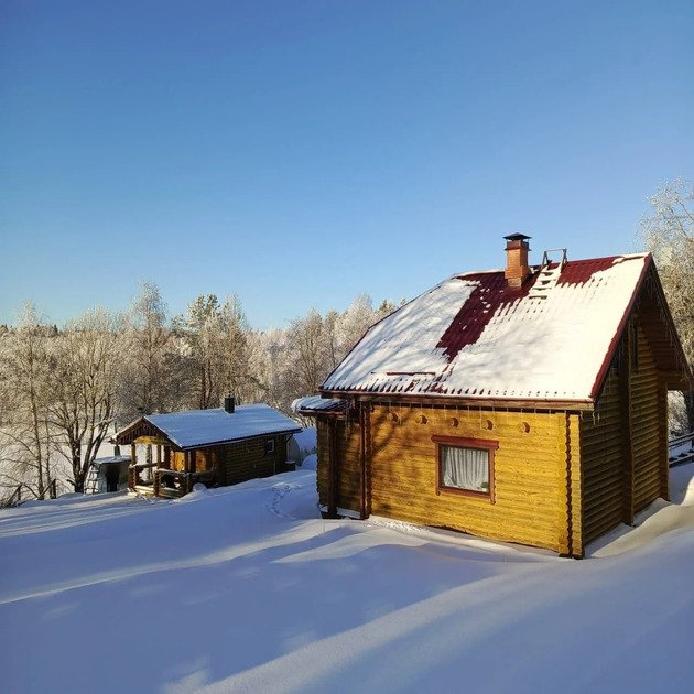 Бревенчатые дома с камином, баней и всеми удобствами прямо на берегу озера, на краю леса в старинном Карельском селе. У каждого дома свой пирс и лодка!