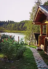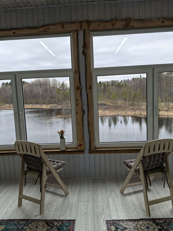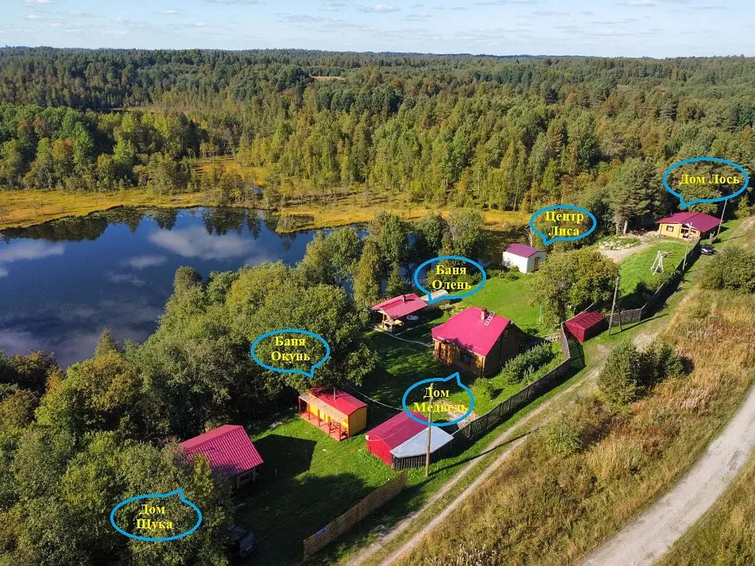 На окраине леса на берегу озера расположились деревянные дома: дом с печью-камином, дом с кроватью-чердаком, дом с сауной, баня и чан. В уединенном месте, без лишних глаз и соседей.