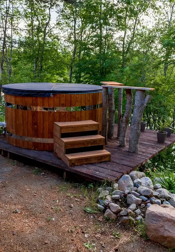 Душевная банька «Олень» с чаном под открытым небом. Идеальное сочетание пара и прохлады для полного обновления.