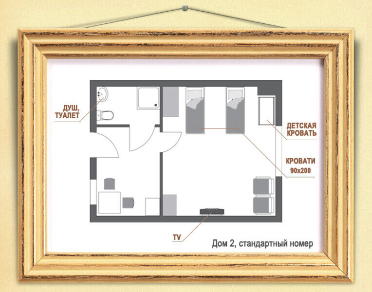 Номер двухкомнатный: первая комната (две кровати бокс-спринг) – проходная во вторую, кресло TV. ( *один номер первая комната — двуспальная кровать).