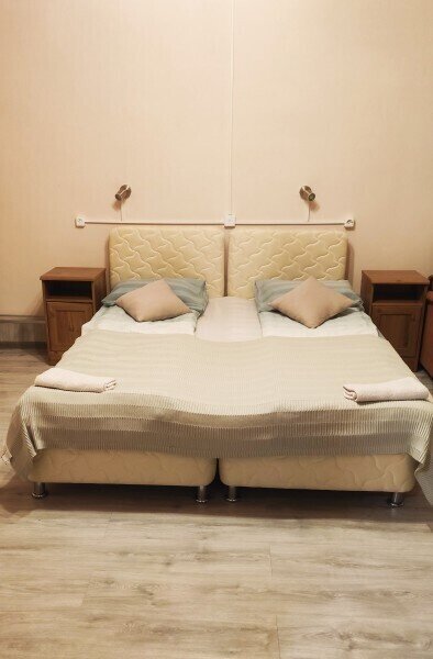 Для тех, кто не нагулявшись за день из последних сил не падает вечером на кровать, возможно, матрас на большой кровати будет тонковат, он уже устарел или устал от своей работы. (На односпальных в другой комнате всё хорошо).