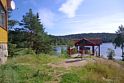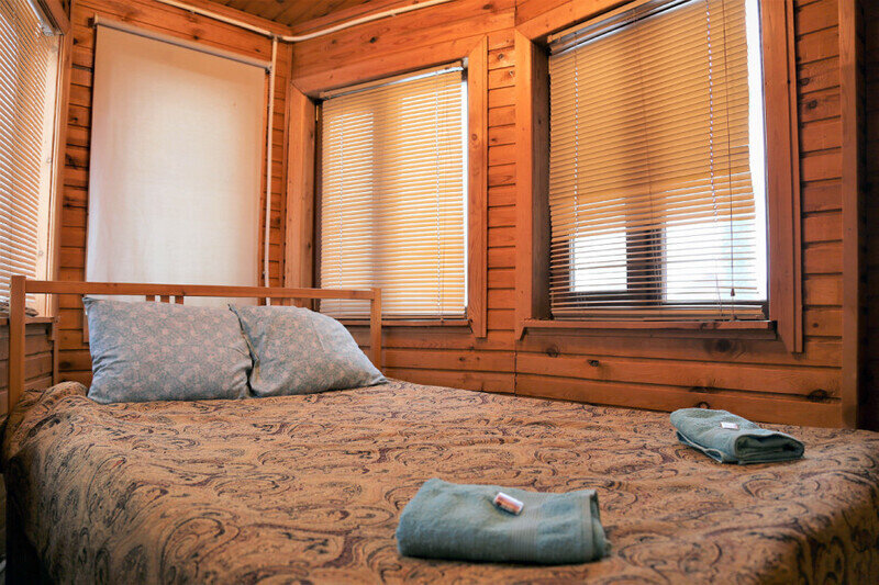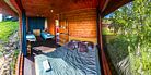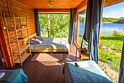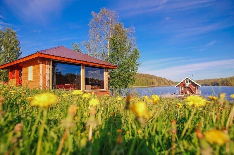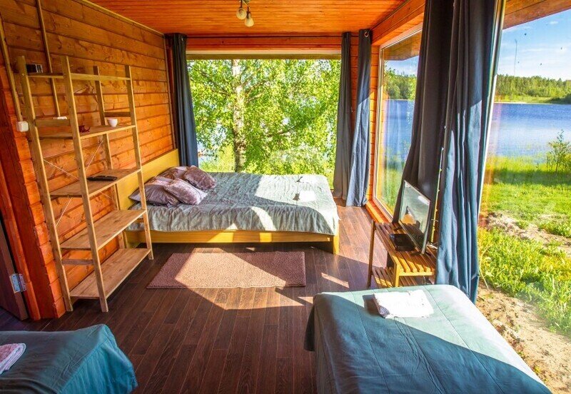 Домик с двумя панорамными окнами, расположен на основной территории с видом на пляж и озеро.