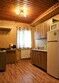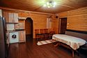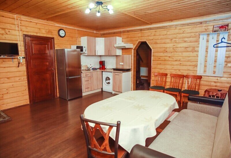 В доме кухня – столовая с обеденным столом, телевизором и диваном.