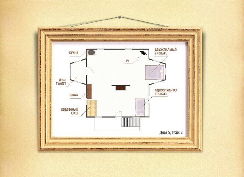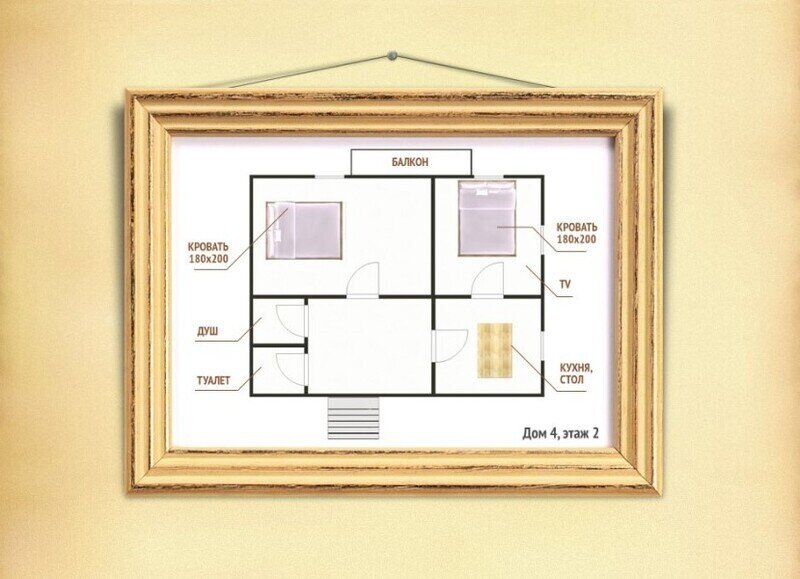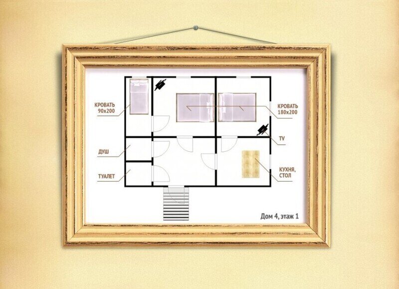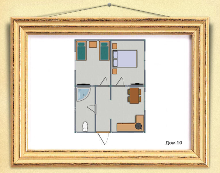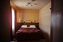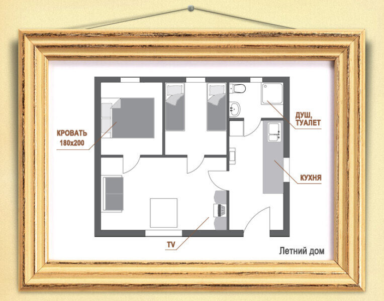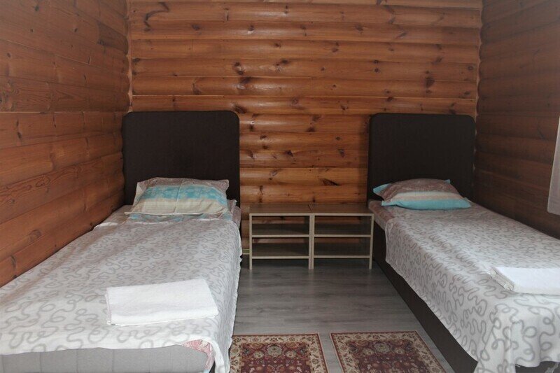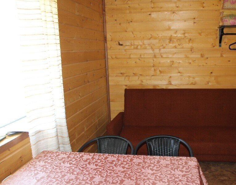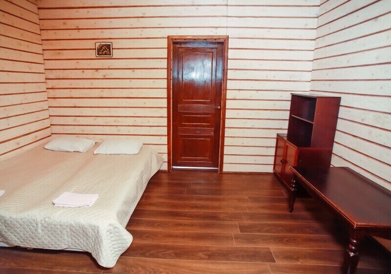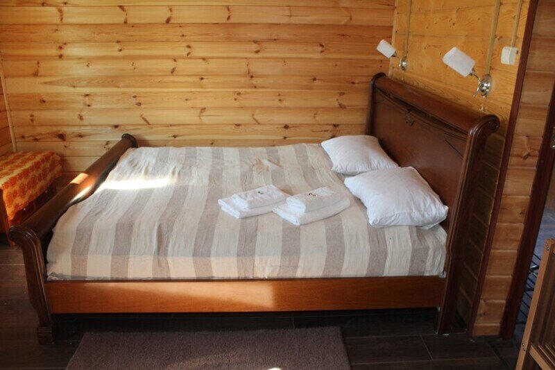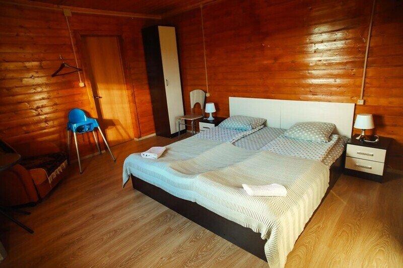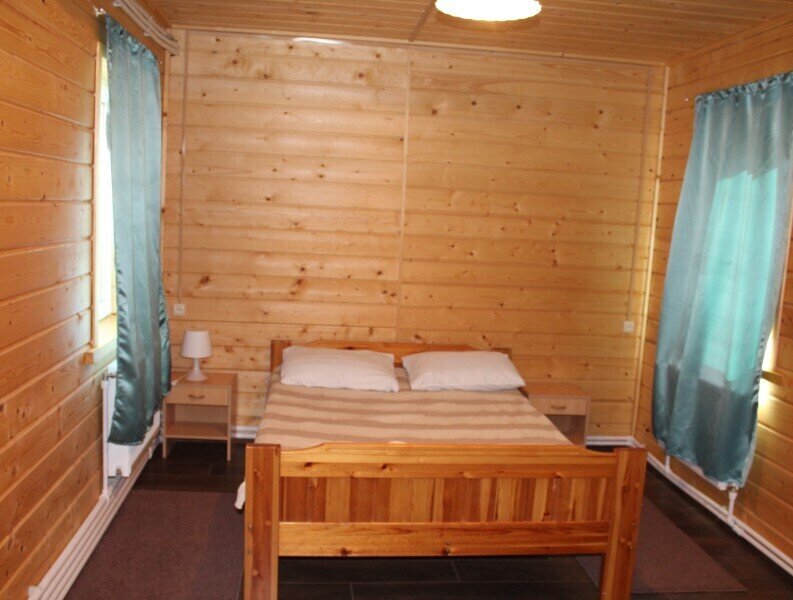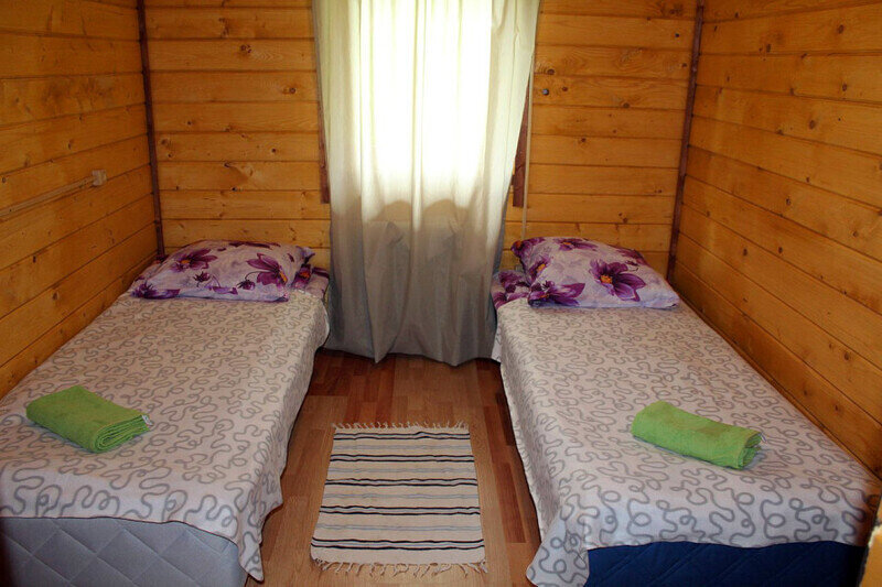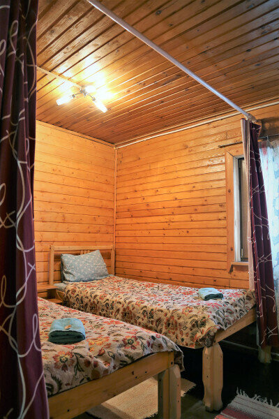 Домик на 4 человека. В доме две комнаты. В одной большая двуспальная кровать, во второй две односпальные кровати.