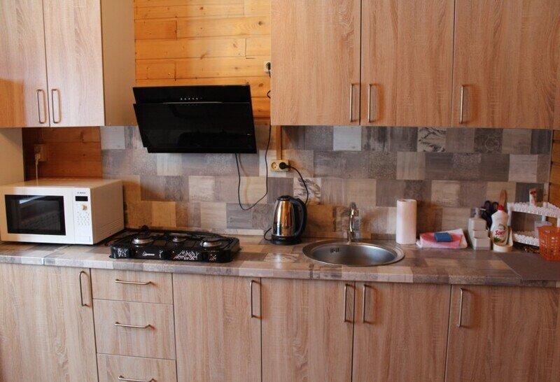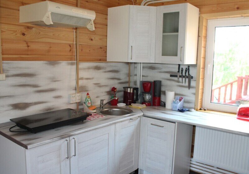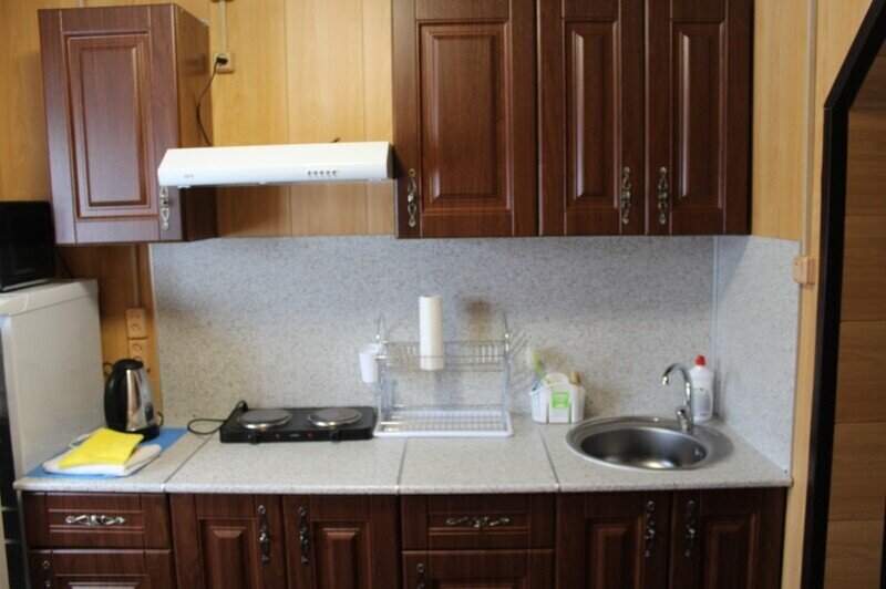 Оснащение - холодильник, чайник, микроволновая печка, индукционная плита, посуда.