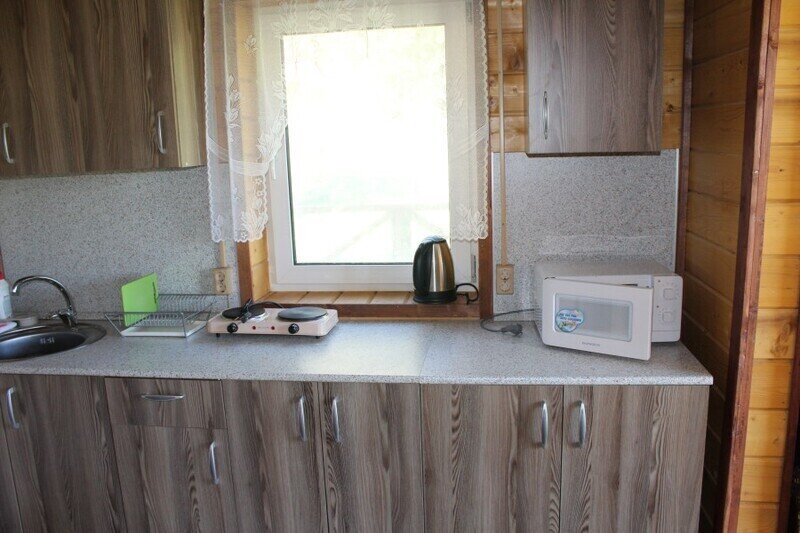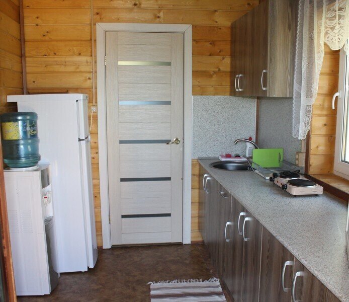 Кухня оборудована: микроволновой печью, электрической плиткой на две конфорки, холодильником и чайником, также есть посуда и все необходимые приборы. Питьевая вода в кулере.