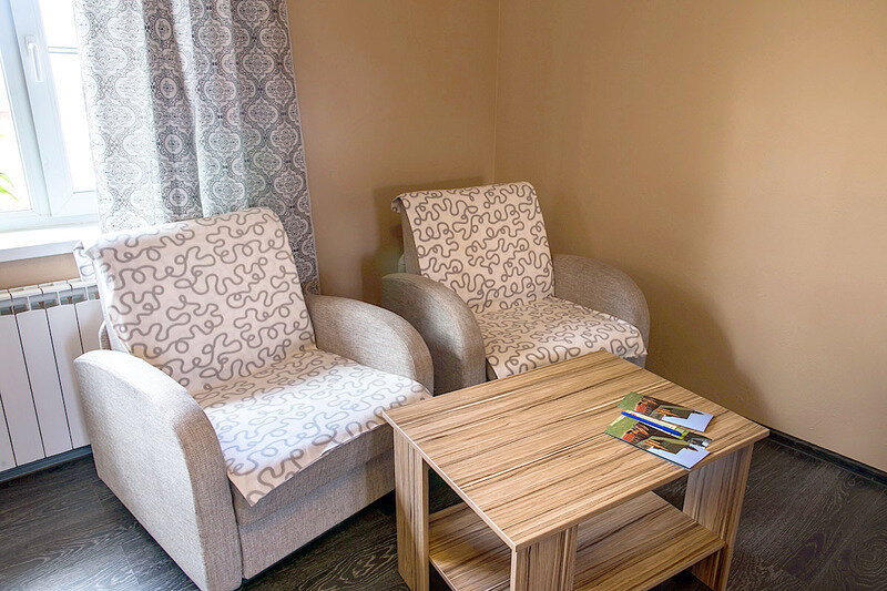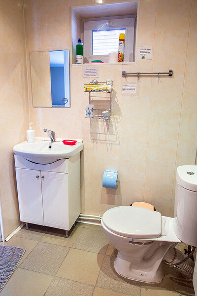 Удобства в каждой комнате: ванная комната с душевой кабиной (горячая вода) туалет; в каждой комнате — ТВ, шкаф, ковровое покрытие, отопление от котельной (батареи); чайник, стол и небольшой холодильник.