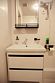 Ванная комната: душевая кабина, туалет и раковина, фен.