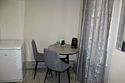 Кухня: обеденный стол, холодильник, чайник, микроволновая печка, плитка, чайник, посуда.