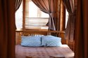 Двуспальная кровать и 2 односпальные кровати (двуспальная кровать в эркере, за перегородкой с дверью),