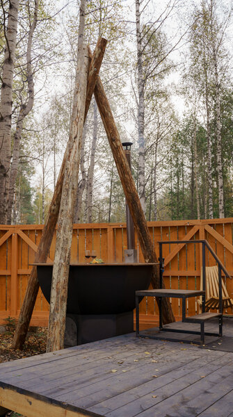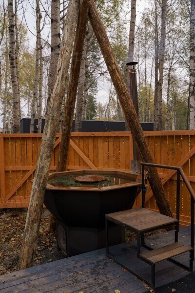 Для посетителей доступны два подогреваемых банных чана, расположенных на берегу озера. Эта уникальная конструкция объединяет в себе функции полноценной бани и купельного чана, в центре которого расположен удобный столик. В этих чанах Вы сможете насладиться купанием в любое время года, а присутствие хвойных и цитрусовых добавок не только наполнит воду ароматом, но и укрепит Ваш иммунитет.