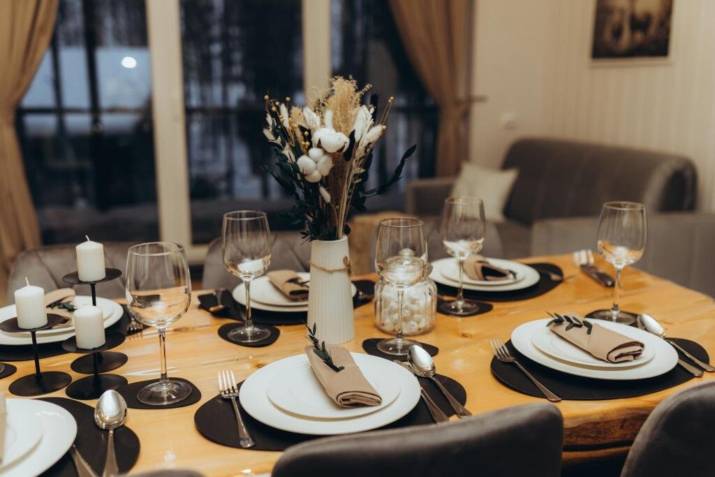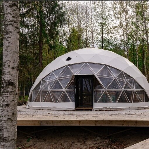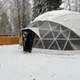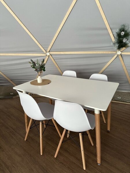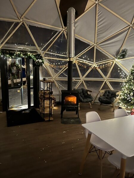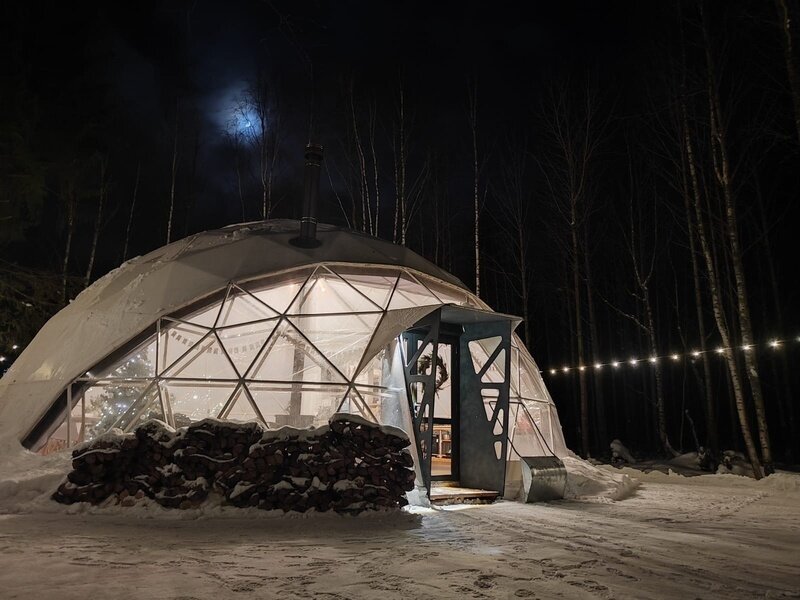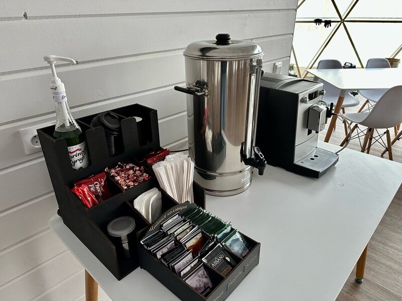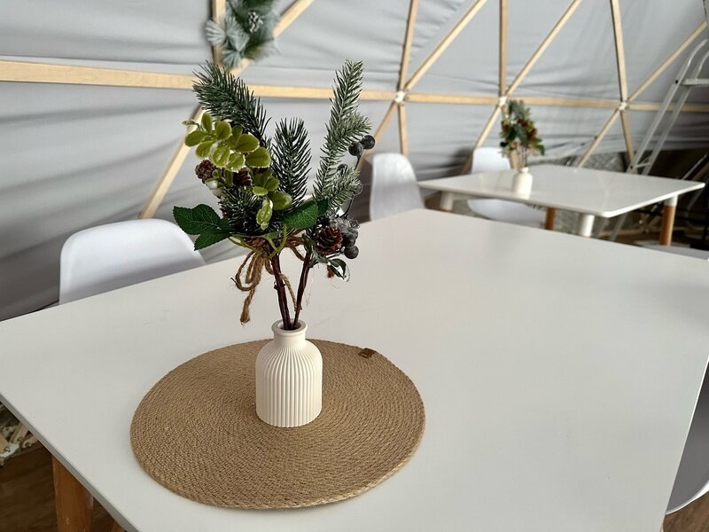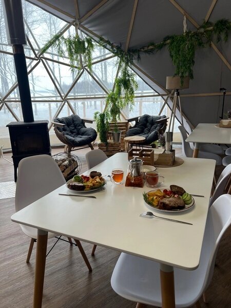 На территории эко-отеля есть уютное кафе-шатер, где можно пообщаться с другими гостями, согреться у камина и насладиться горячим кофе. За столы легко вмещается 30 человек.