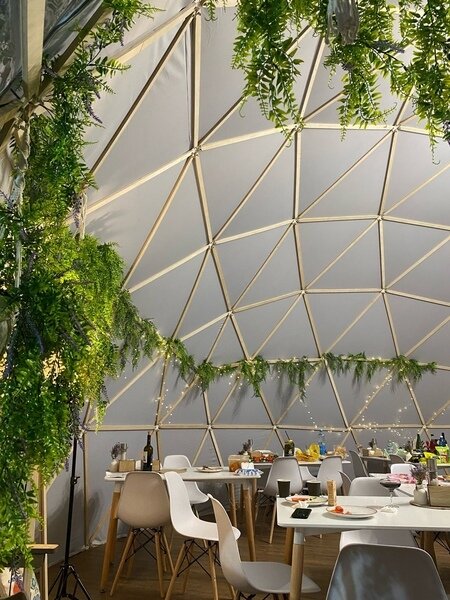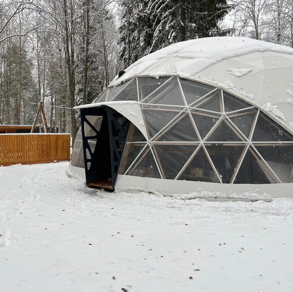Шатер для мероприятий вместимостью до 30 человек. Оснащен теплым полом, камином, барной стойкой и большим телевизором. Есть необходимая мебель — стулья и столы. Условия аренды и технические детали обсуждаются индивидуально. Минимальный срок аренды — 3 часа.