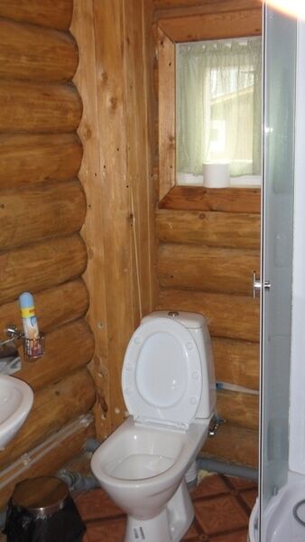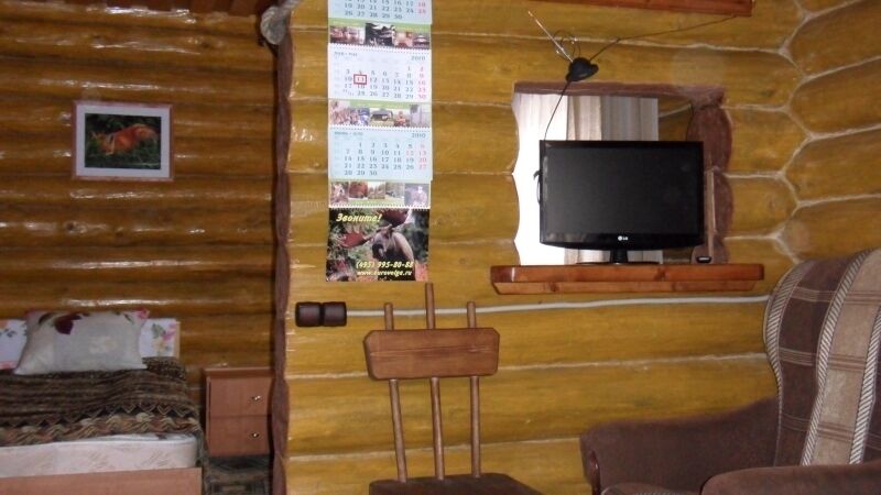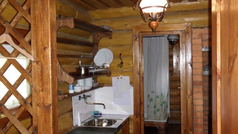 Санузел с душевой кабиной с газовой колонкой, раздевалка, кухонная зона, гостиная с мягкой мебелью (диван, 2 кресла, деревянный стол), дровяная печь «Вертикаль», ЖК-телевизор, спальня.