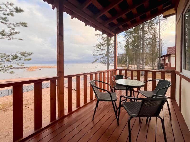 Уютный номер Джуниор сюит - 1 расположен на 1 этаже комфортабельного двухэтажного домика на берегу Онежского озера. Панорамное окно, шикарные виды на озеро и крытая меблированная терраса придают особый шарм и дарят неизгладимые впечатления. Номер идеально подойдёт для комфортного проживания небольшой семьи из 2-х или 3-х человек (при заказе доп. места). Если у вас семья побольше, то почти всегда можно заказать еще один номер на втором этаже.