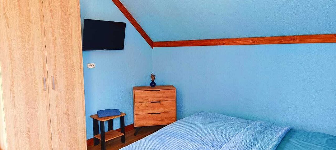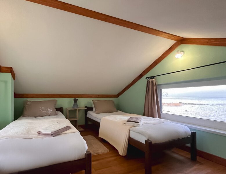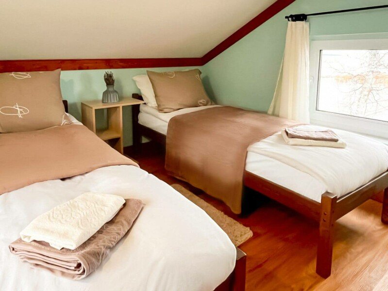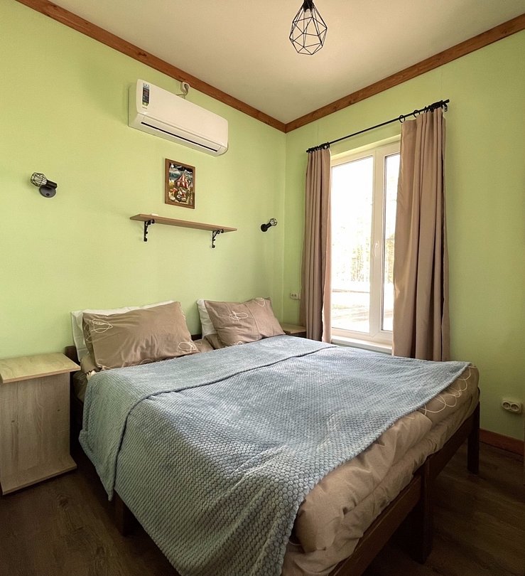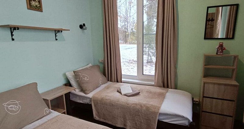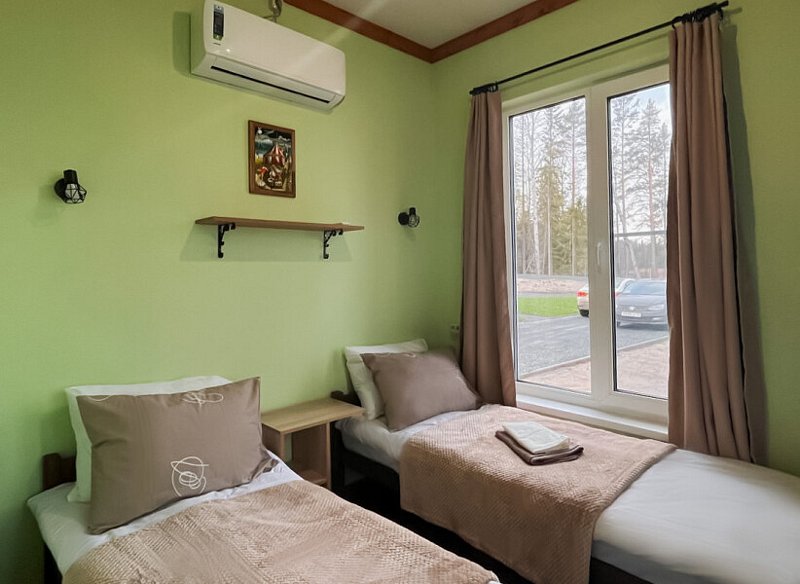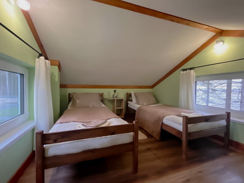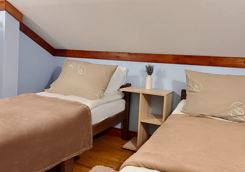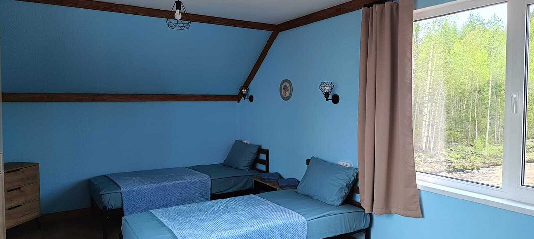 Две комнаты в трехкомнатном доме с мансардой. Уютный двухэтажный номер идеально подходит для отдыха небольшой компании друзей. Номер рассчитан на проживание 2–4 человек (два основных и два дополнительных места).