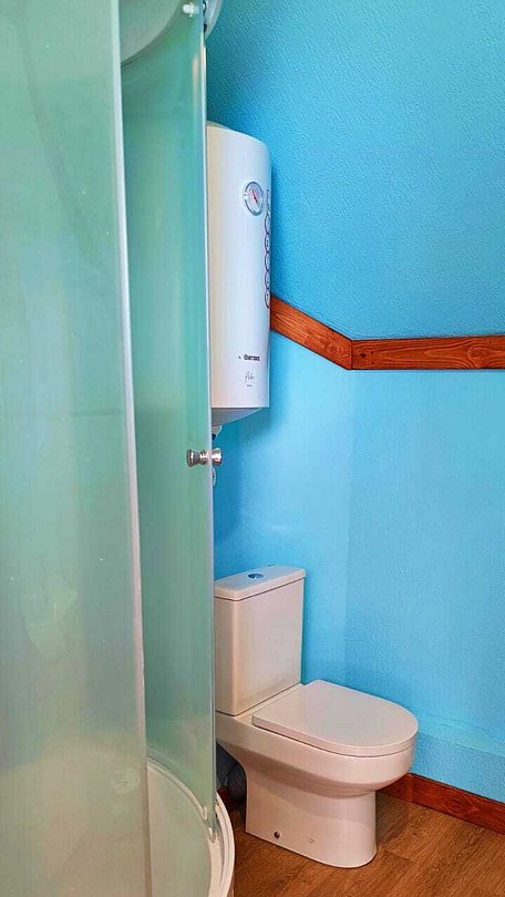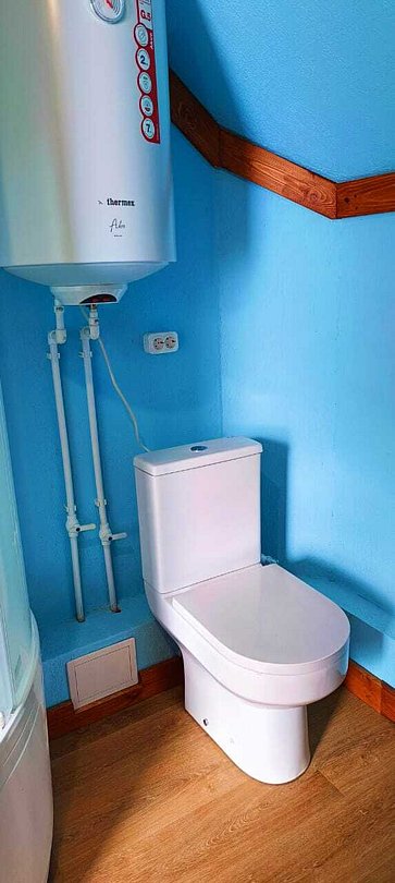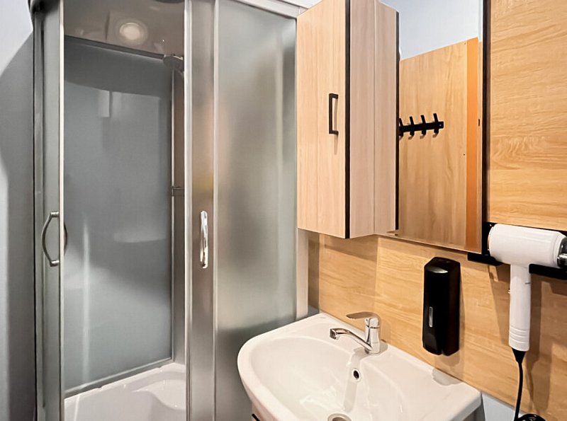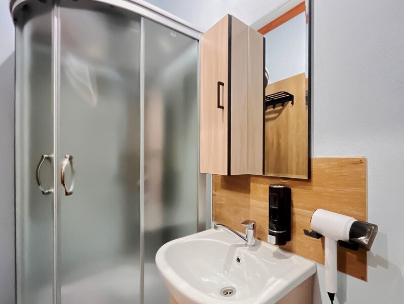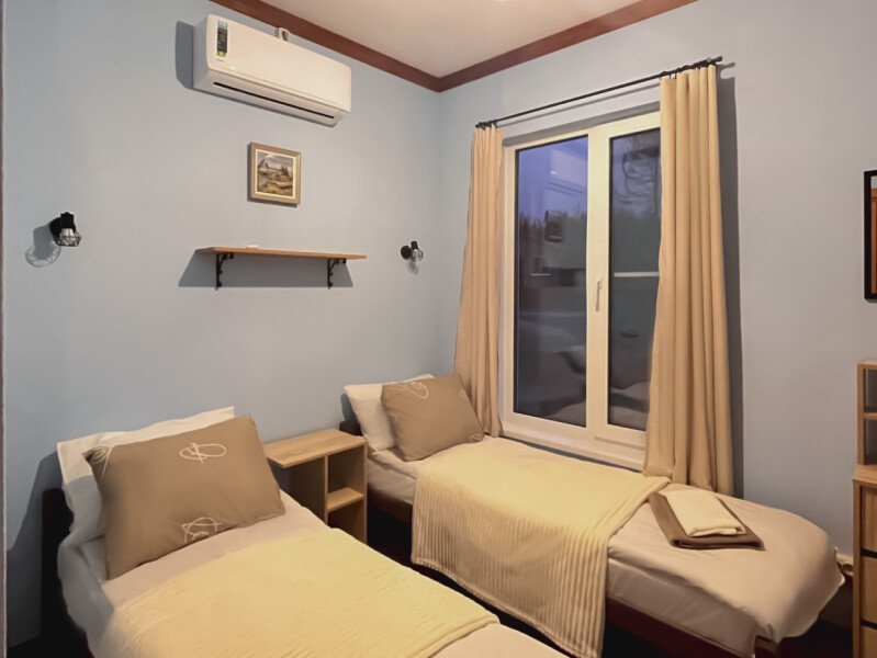 В номере: две односпальные кровати (или одна двуспальная по запросу), комод, тумбочки, вешалка и кондиционер. Санузел с душевой кабиной и феном общий на два номера. Если бронируете только один номер, возможно совместное использование санузла с другими гостями.