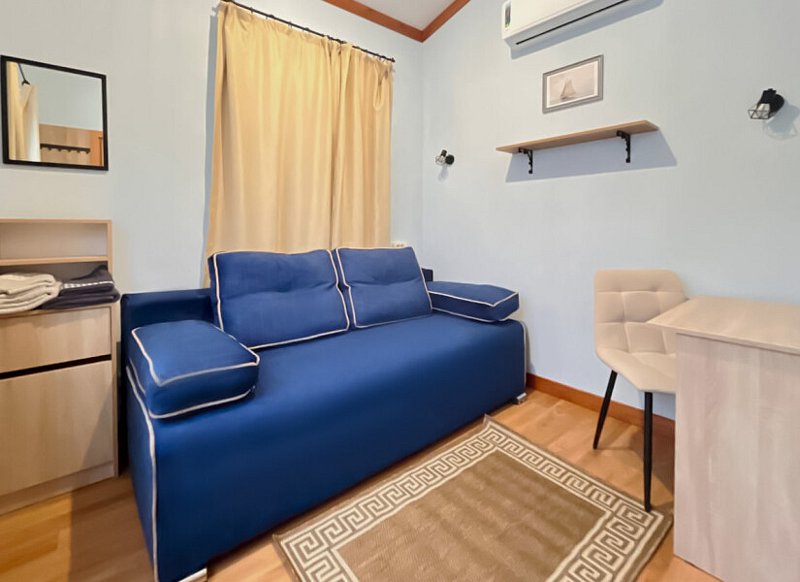 В одной комнате - удобный диван с спальным местом, в другой - двуспальная или две односпальные кровати (на ваш выбор). В номере также есть прихожая и санузел с душевой кабиной.