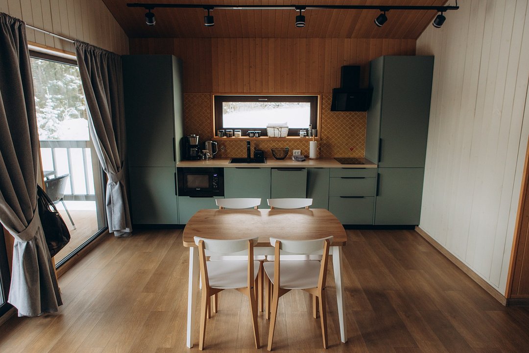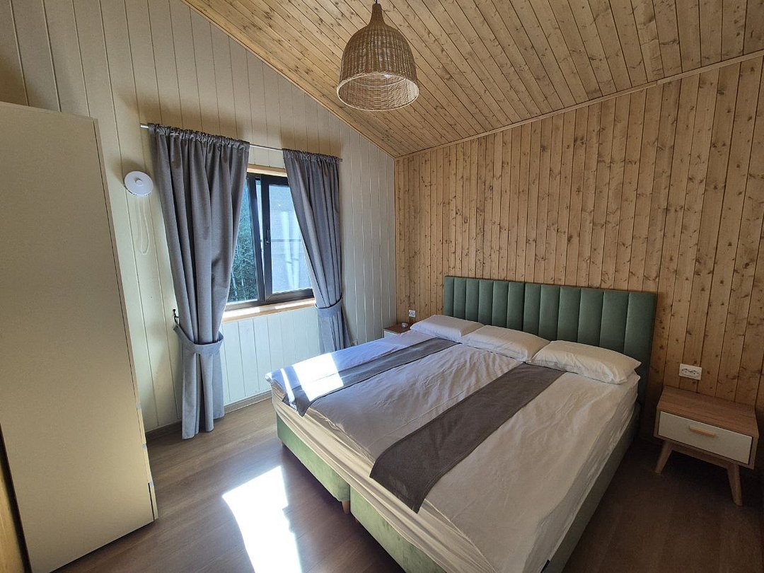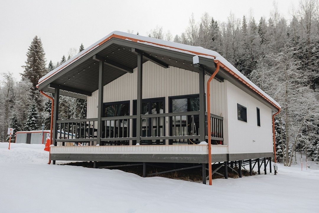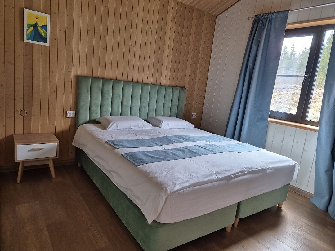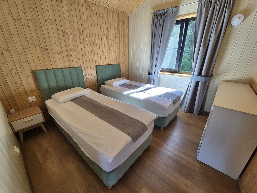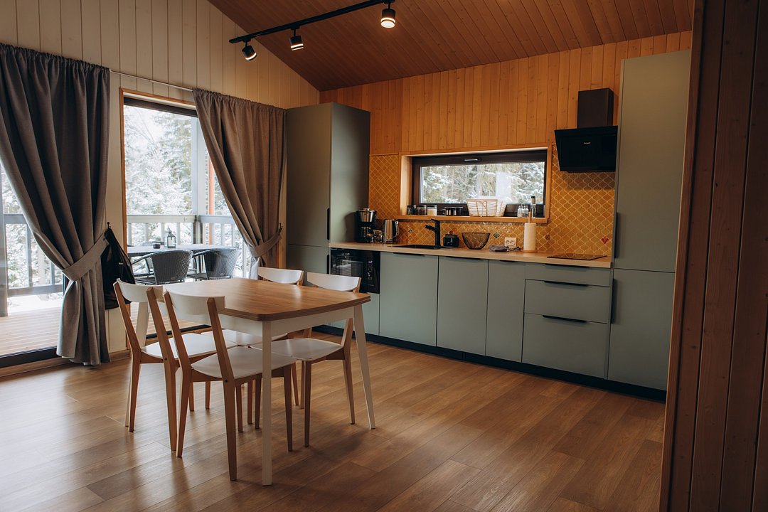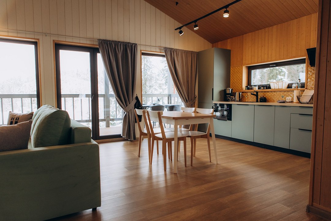 Для проживания гостей предлагаются новые дома с одинаковыми условиями, с панорамным видом на озеро и скалу. В домах максимально продуман комфорт, бытовая функциональность и удобство интерьера, чтобы ваш отдых проходил легко и непринужденно. В каждом доме имеются две спальни, ванная комната, просторная кухня-гостиная и терраса. В гостиной есть раскладной диван для дополнительных гостей. Современные удобства: кофемашина, холодильник, посудомоечная машина, а на террасе — газовый гриль для приятных вечеров.