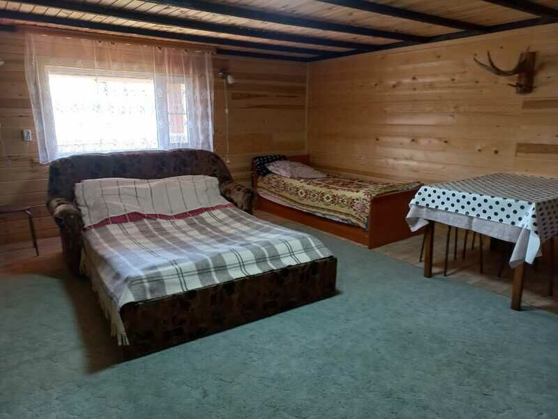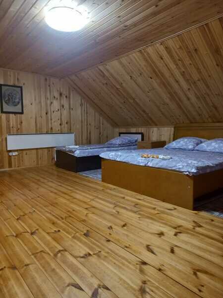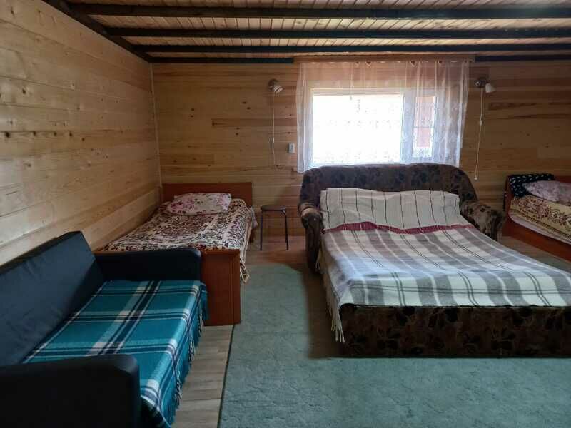 На первом этаже 2 местный диван ,на мансардном этаже 2 односпальные кровати и 1 двуспальная и также мягкая раскладушка.