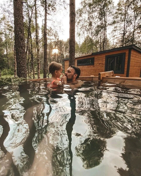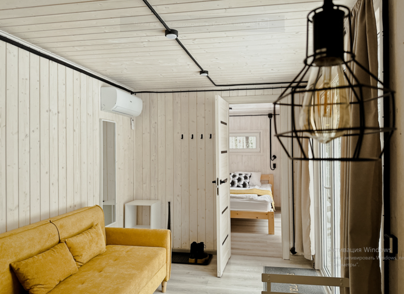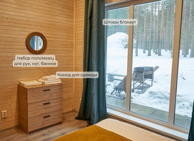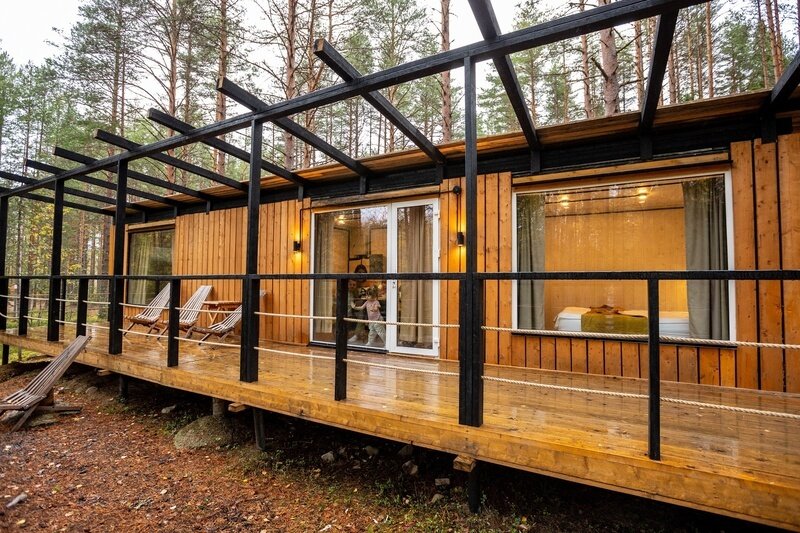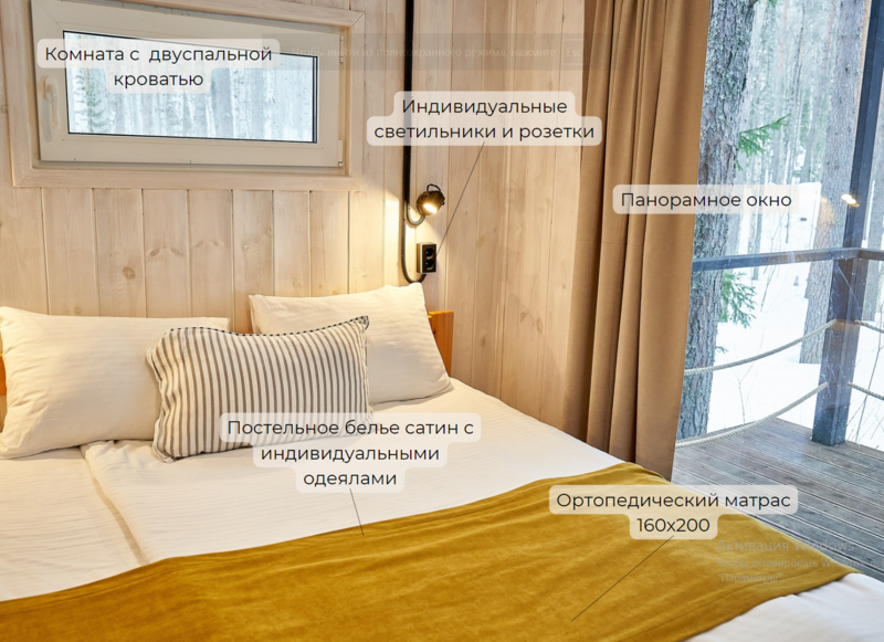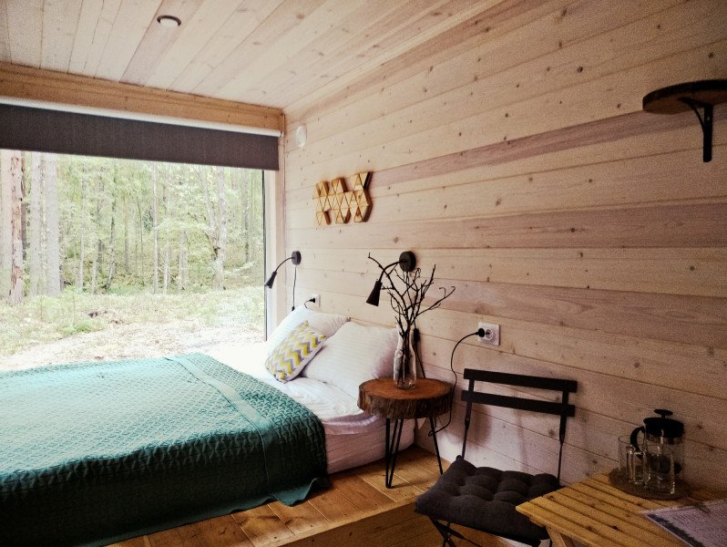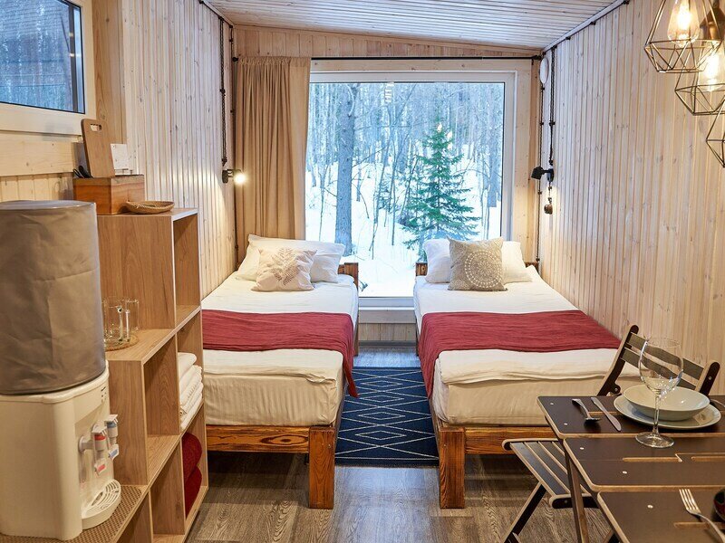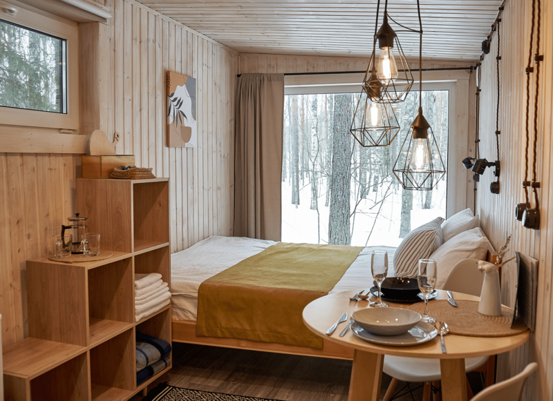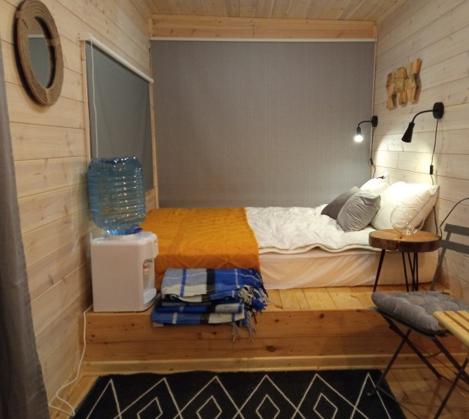 Лесные домики-глэмпы NewCamp — это тепло и уют. Гостей ждёт двуспальная кровать (или две раздельные при необходимости) с ортопедическими матрасами и белоснежным бельём, панорамное окно во всю стену с видом на лес и авторский декор из натурального дерева. Внутри — персональный душ и туалет, пол с подогревом, полотенца.