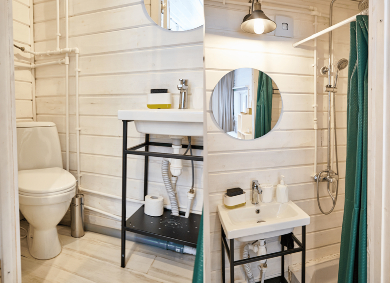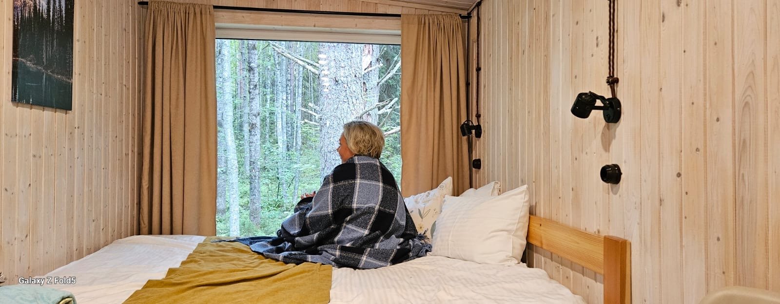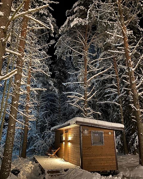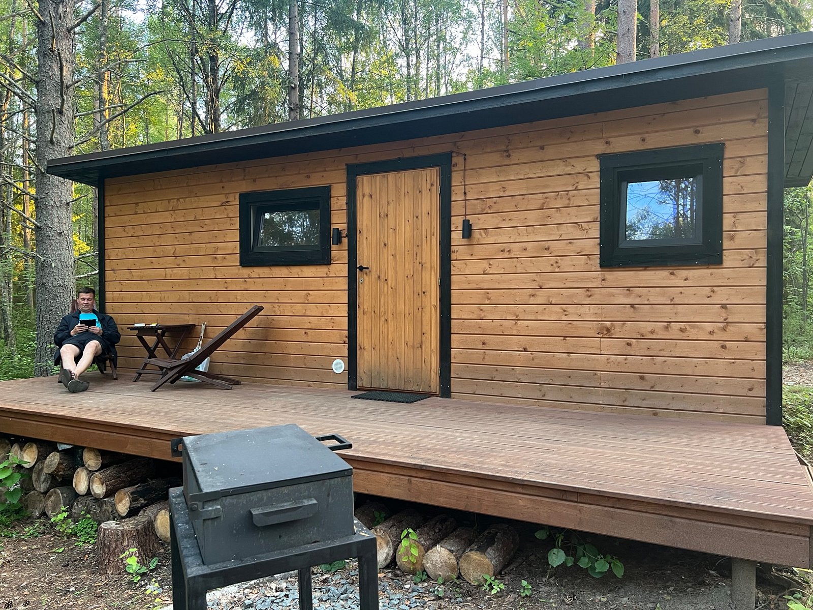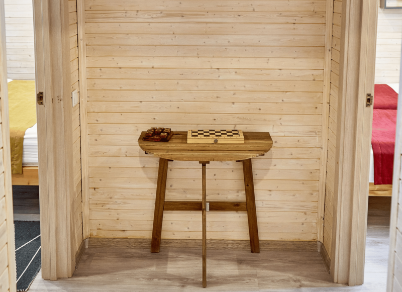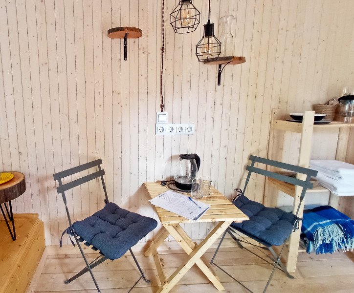 На кухне вы сможете приготовить еду и напитки, продукты можно купить в магазине в поселке Эссойла в 2 км от глэмпинга. В доме комфортно размещаются от 4 до 6 человек.