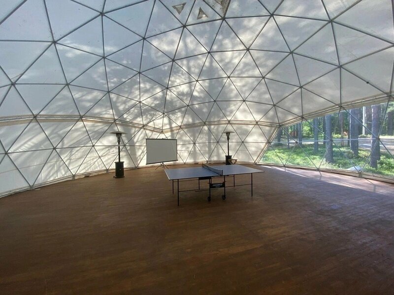 Красивый и просторный шатёр (12x12 м) с деревянным настилом, в котором удобно проводить хоть корпоративный тренинг, хоть йога ретрит.
