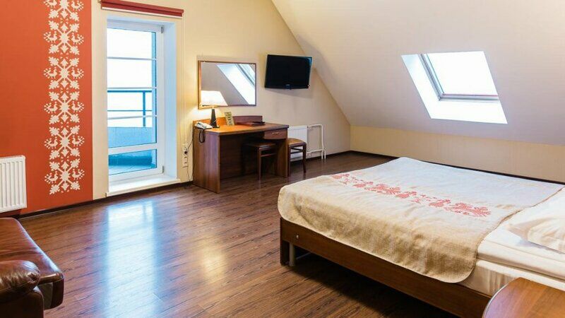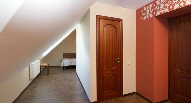 Номер оформлен в современном стиле с акцентом на уют и комфорт. В интерьере преобладают тёплые оттенки и деревянные элементы, что создаёт атмосферу уюта. Под мансардной крышей номера располагаются пять удобных кроватей, подходящие как для индивидуального размещения. Яркие шторы придают комнате оригинальность и защищают от излишнего света, что позволяет создать расслабляющую обстановку.Услуги и удобства