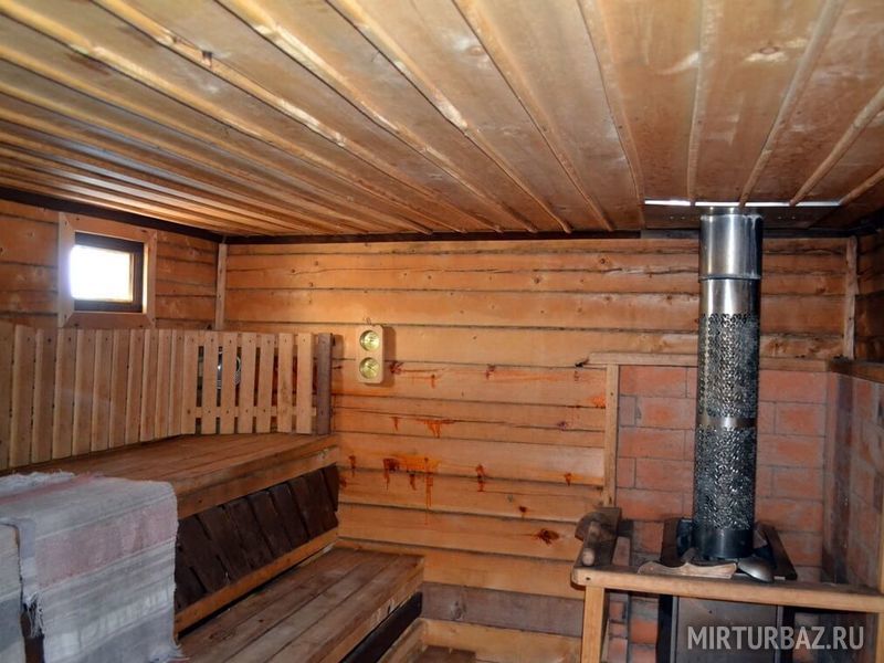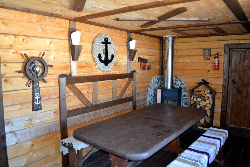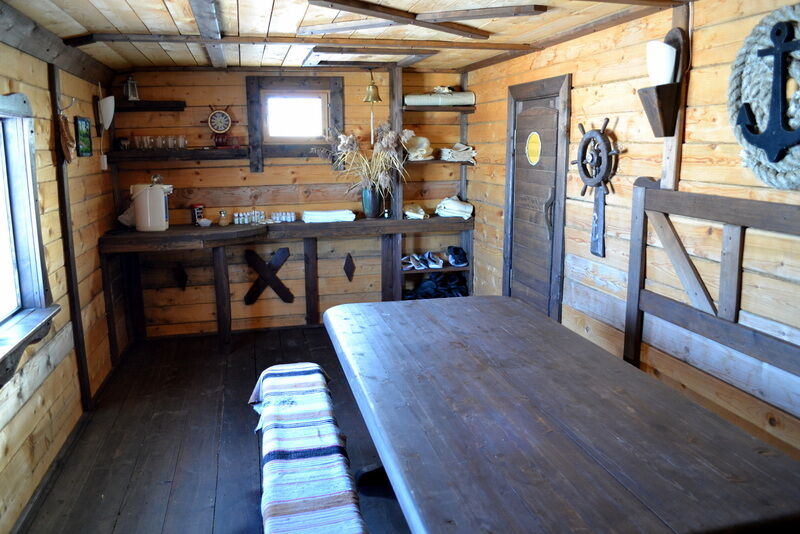 Баня расположена непосредственно над водой Онежского озера. Внутри есть просторная комната отдыха с отдельной печью-камином, где так душевно посидеть в теплой компании, испить травяного чая после парной с вениками. Большой предбанник, две душевые кабины с холодной и горячей водой. А главное, для тех кому пар покажется очень крепким, выйдя на улицу попадет на уютную площадку со скамейками и деревянным полом.