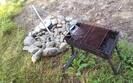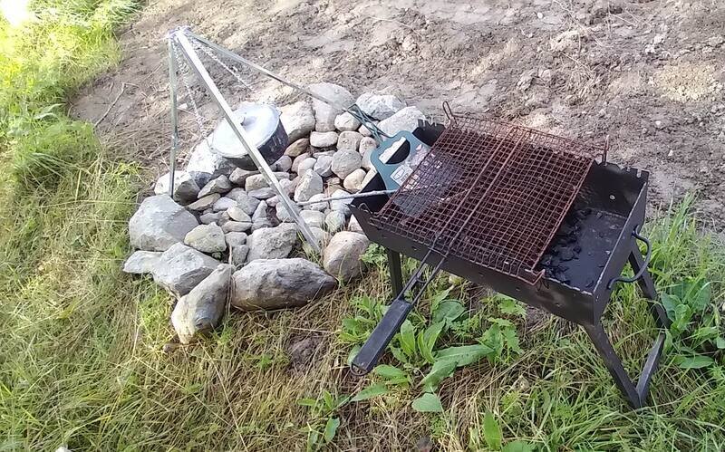 Рядом деревянная беседка со столом и скамьями, мангал с решеткой и шампурами, казан, барбекю, коптильня. -
