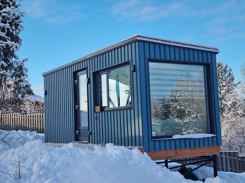 Двуспальная кровать, спутниковое ТВ и панорамное окно. Кухонная зона: индукционная плитка, мини-холодильник, СВЧ, чайник, посуда для приготовления и приема еды, стол.