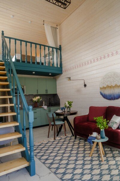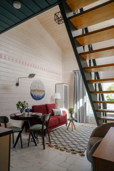 Двухуровневый номер в таунхаусе. Спальня мансардного типа с большой двуспальной кроватью расположена на втором уровне. В гостиной мягкая мебель, кабельное ТВ.