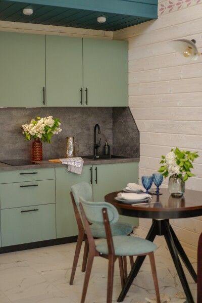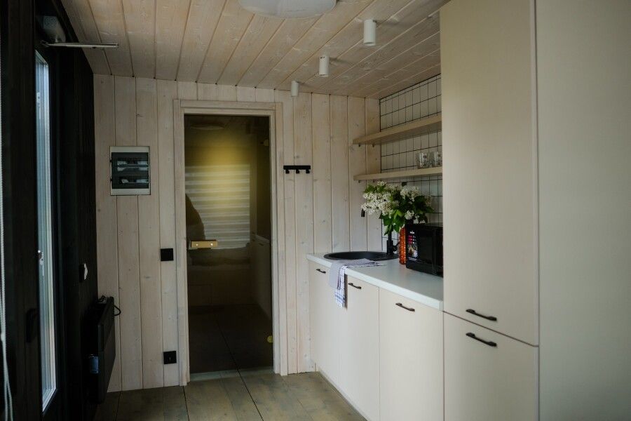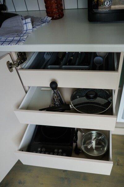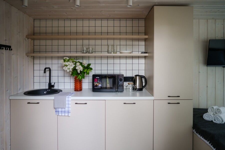 На раскладном диване возможно разместить двух дополнительных человек. Кухонная зона: индукционная плитка, мини-холодильник, СВЧ, чайник, посуда для приготовления и приема еды, стол.
