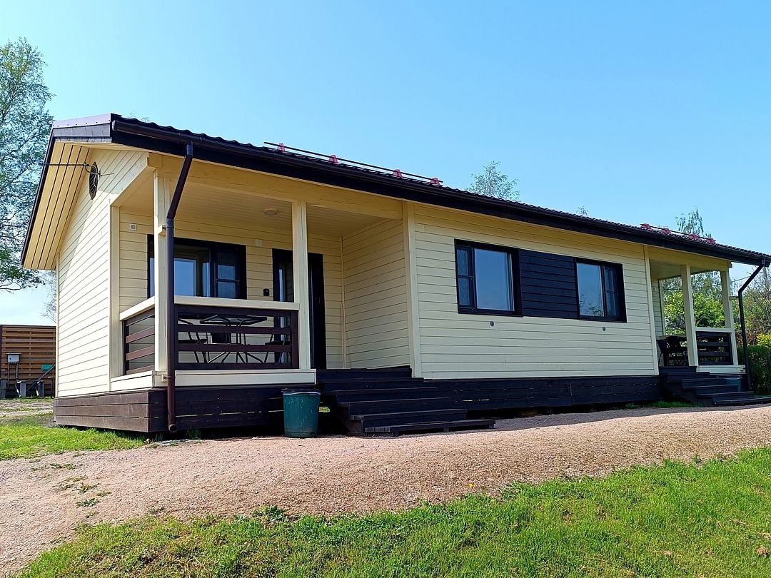 В доме две комнаты (двуспальная кровать в первой комнате и 2 односпальных кровати во второй, кровати можно сдвигать), кухня-гостиная с диваном, туалет, душ, сауна. Выход из всех помещений на открытую террасу. Отопление: печь-камин и электрообогреватели. Открытая терраса с уличной мебелью. Место для пикника, мангал. Расположен на берегу озера Кармаланьярви (35 метров до озера), свой выход к воде (можно купаться с мостков).