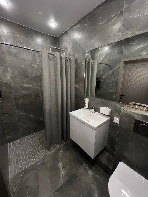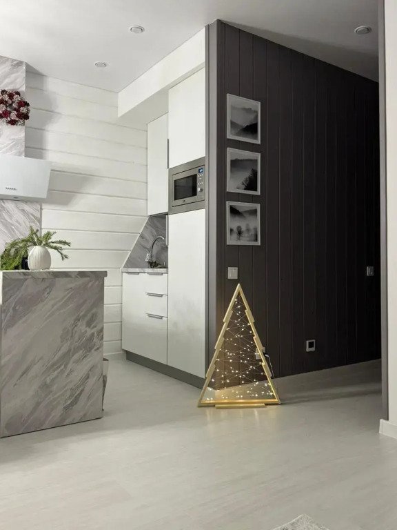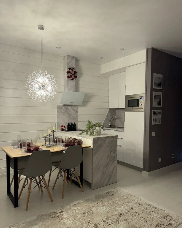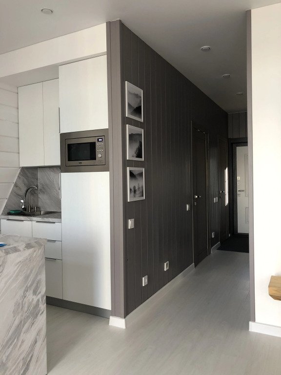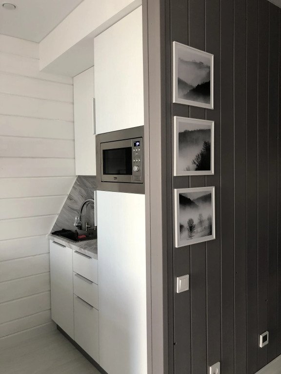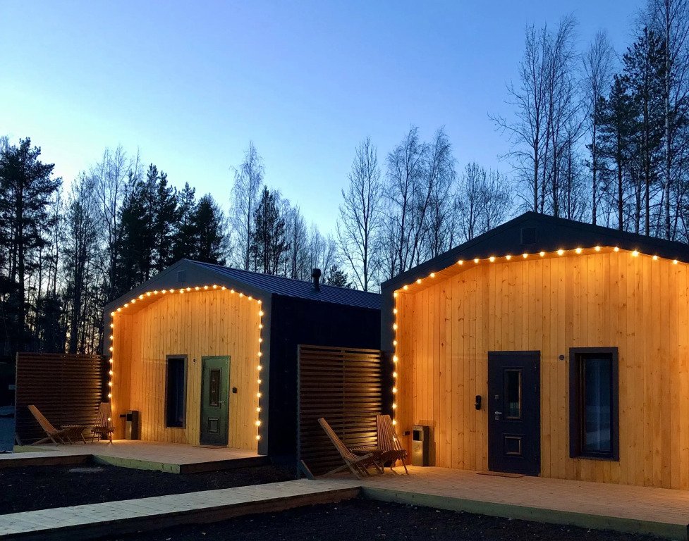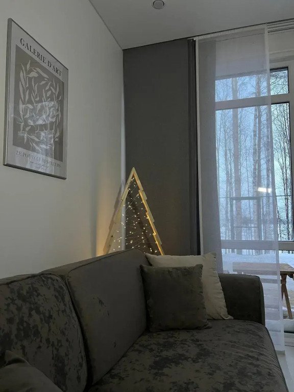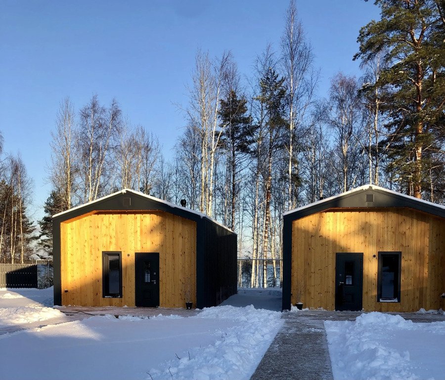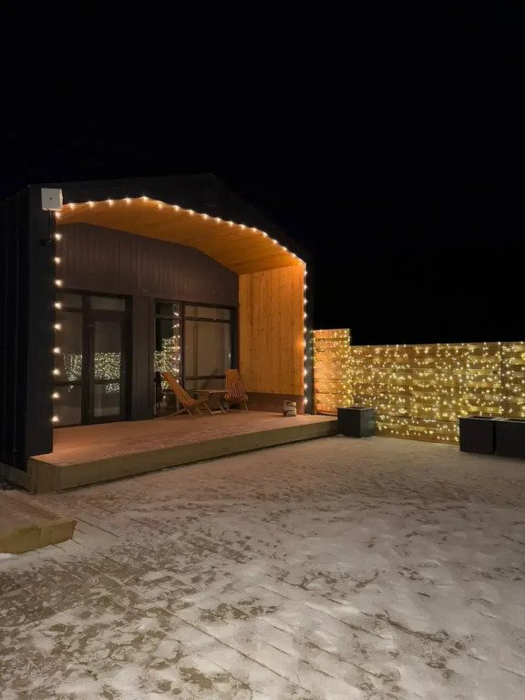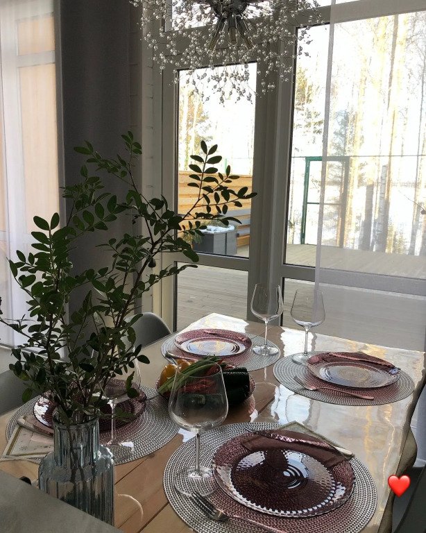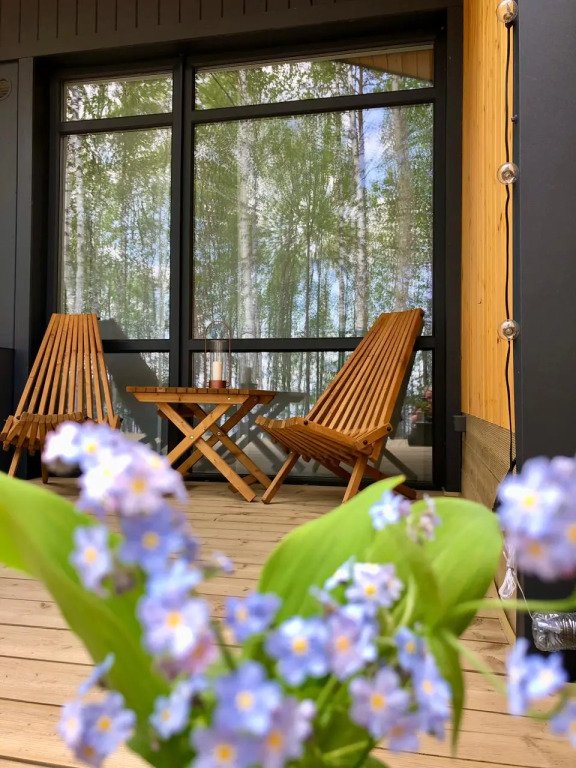 Частный дом выполнен в скандинавском стиле. Панорамные окна выходят на озеро и лес. В доме есть просторная терраса, оборудованная кухня, отдельная спальня с двуспальной кроватью, санузел, горячая вода и отопление.